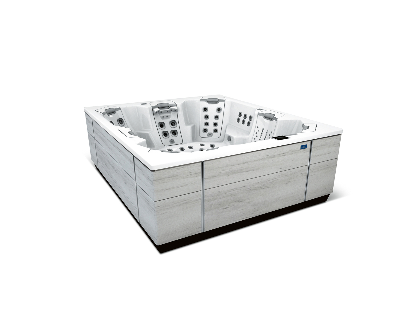 The M9 whirlpool is designed for outdoor use. Its ergonomically shaped seats ensure a comfortable sitting position. Interchangeable Jet-Paks with different massage functions are integrated in the backrests and can be individually arranged according to personal preference. The controls for the massage therapy, light, sound and water features are intuitive to use and conveniently positioned. The water care system is located in the wall of the whirlpool for easy maintenance and cleaning.