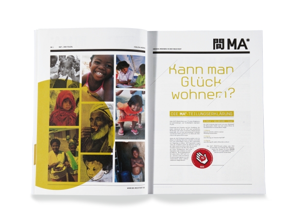 Starting with a property in an unfavoured area in Frankfurt/Main and with a negative history of the building, a marketing strategy that went beyond classic real estate marketing was developed. For the communication concept “MA – Wohnen anders” (“MA –living differently”) a self-contained language was conceived that challenges existing patterns of thought, asking “Kann man Glück wohnen?” (“Can you live luck?”). The magazine-style layout of the brochure combines a cosmopolitan image language with short information in texts and eye-catching graphical elements.