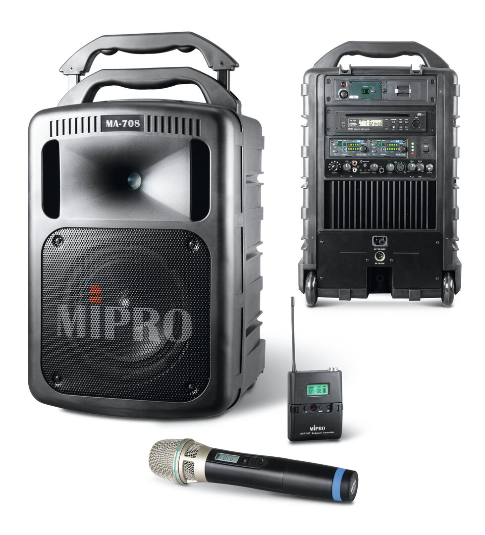 The MA 708 portable wireless speaker system accommodates a two-way sys-tem in its robust plastic enclosure. It is driven by a high-performance Class D amplifier and is easily capable of addressing medium- to large-sized spaces. Also included in the enclosure are several wireless microphone receivers, a mixing unit, a CD / USB player and a Bluetooth interface. The rechargeable battery system does entirely without cables and can be effortlessly transported using a clever trolley system. Moreover, it includes a storage compartment for two handheld or beltpack transmitters.