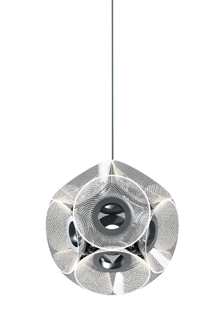 The Magellan luminaire fascinates with both the design-defining underlying principle of unity and diversity, as well as an innovative form that is complemented by a high degree of convenient functionality. A core structure serves as a platform for arranging several lampshades in a cluster for realising individual configurations, material options and lighting effects. This results in almost aura-like voluminous lighting.
