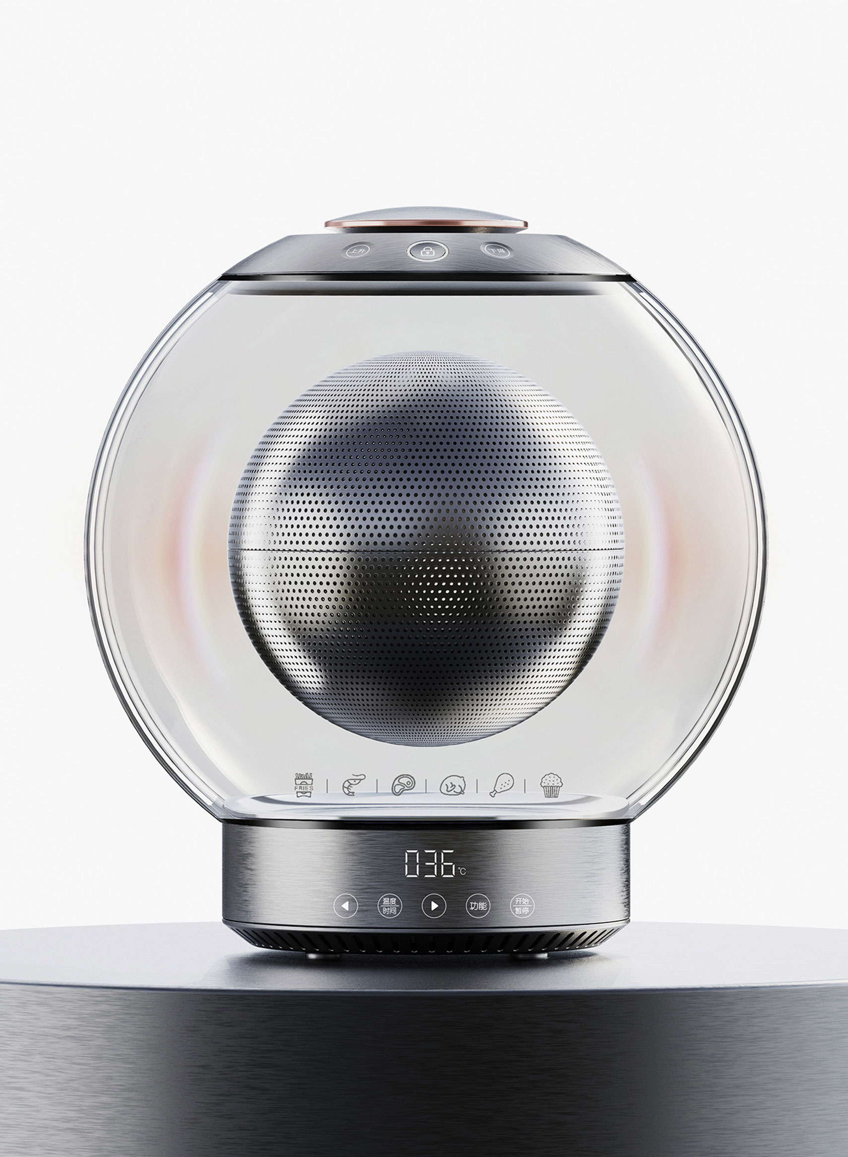 The MAGNETIC LEVITATION AIR FRYER uses a high-speed fan and heating tube to create 360-degree hot air circulation, making food crispy without oil. The round frying basket is suspended by magnetic force, allowing 360- or 720-degree rotation. This innovative design ensures even heating without turning the ingredients, providing a novel and efficient oil-free cooking method. Red Dot Award: Design Concept | Concept | Kitchen Appliances and Accessories