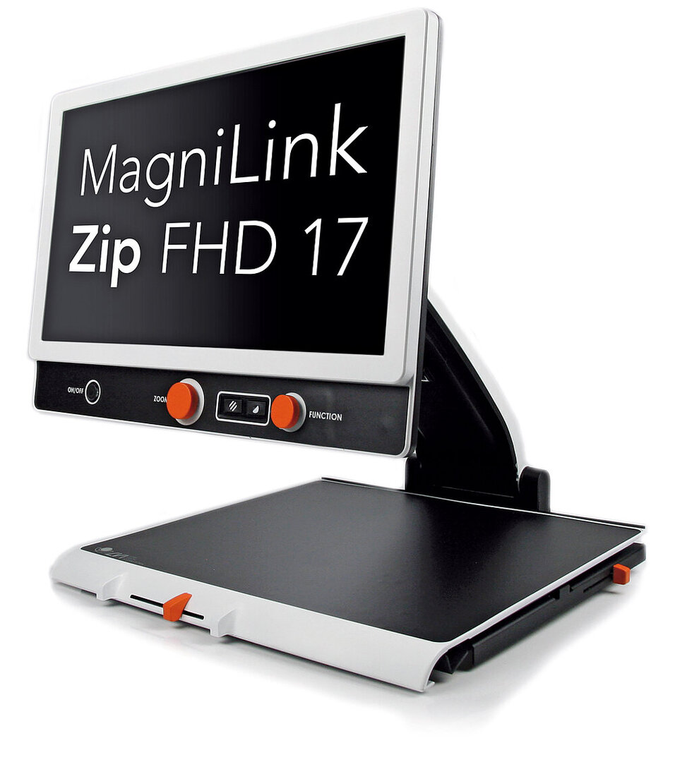 The MagniLink Zip is a fully functional video magnifier, which can be folded when not in use or for transport. The system is available with a 13” or 17” monitor that is connected to a full HD reading/distance camera. The easily accessible rotating knobs and buttons facilitate intuitive operation. The device can also be used with a battery and an adjustable reading table.