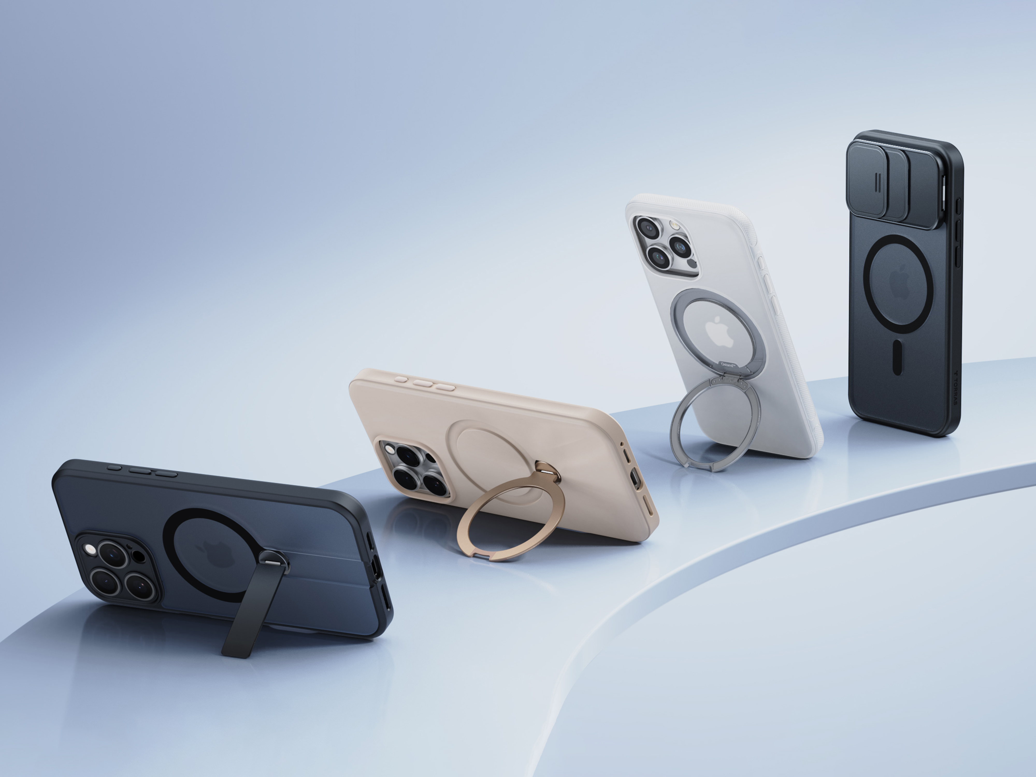 The MagSafe TORRAS case for smartphones combines a flexible device stand with robust protection, all without compromising MagSafe charging functionality. The seamlessly integrated stand supports orientation in both portrait and landscape modes. Its slim, ring-shaped stand with an efficient shock absorber can be swivelled 360 degrees. Depending on the model, refined locking mechanisms allow quick angle adjustment – ideal for outdoor and professional use. Dual-layer air cushions offer reliable protection against damage through dropping.