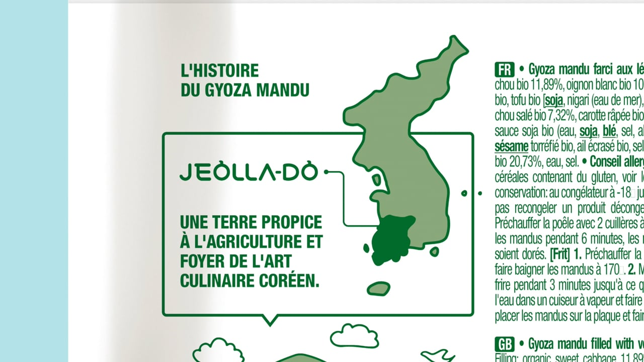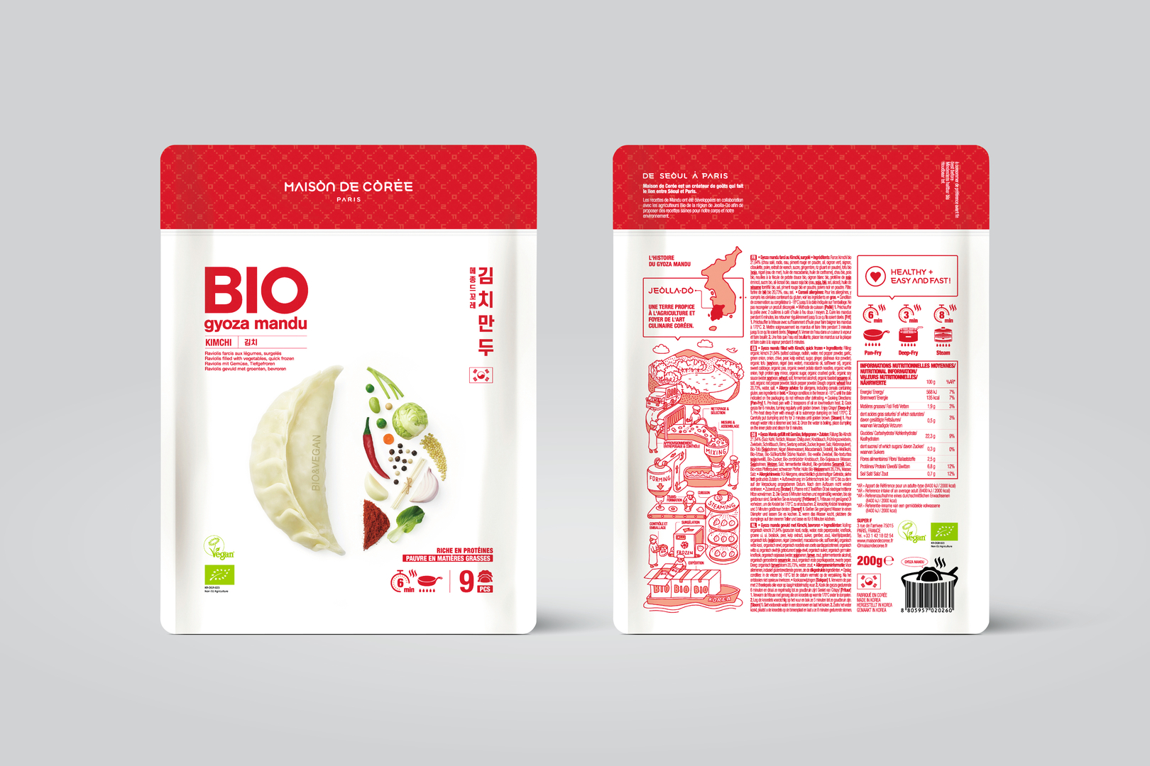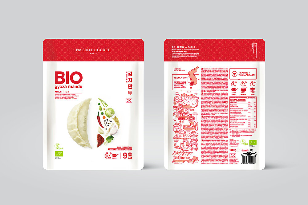 The focus of this packaging for Maison de Corée is to break down the prejudice against Asian dishes by introducing environmentally friendly and clean food through the “Bio & Vegan” project. The ingredients of the product Bio Gyoza Mandu are displayed in a way that emphasises freshness and health. The packaging design of the beverage Bio Alo, aimed at European consumers, highlights the product name in an eye-catching manner, especially by repeating the word “BIO” (for organic) on the corners of the bottle. A transparent window in the shape of an aloe vera plant shows the main ingredient, aloe gel.