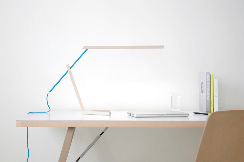 The contrasting effects of the pale wood and light-blue aluminium tube accentuate the contours of this energy-saving desk lamp.