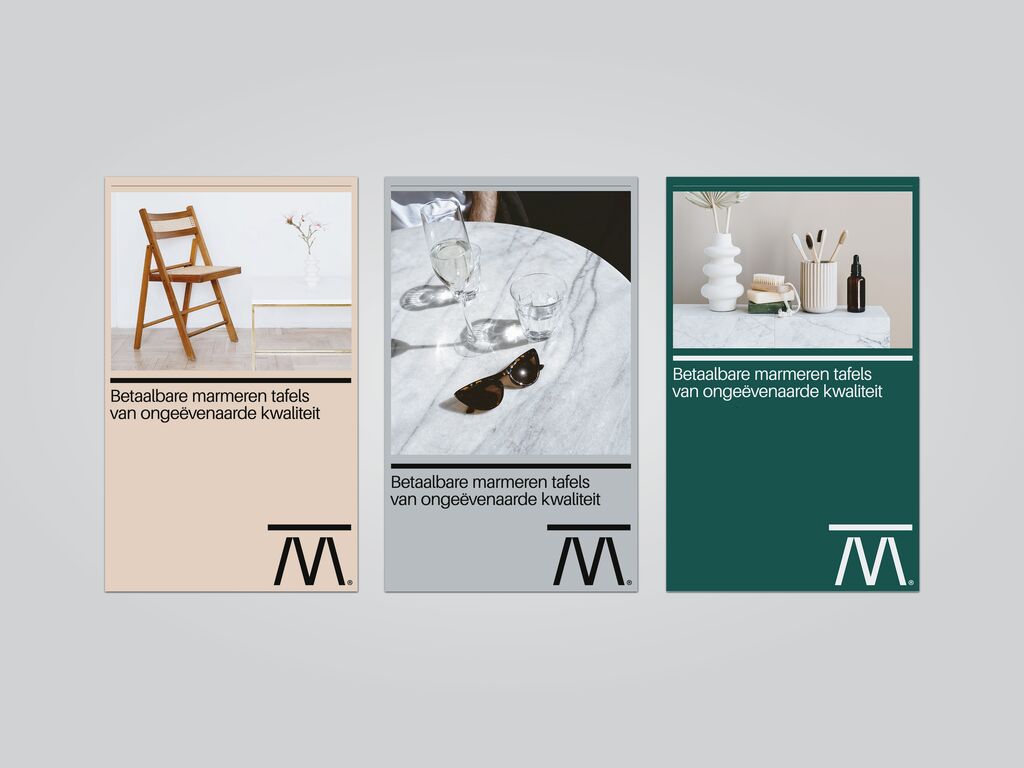 MarbleSteel is a Rotterdam-based interior design store that specialises in marble furniture. The challenge was to design a logo and visual identity that would translate the quality of their products and help them stand out in a competitive market. The brand symbol is inspired by a table and its steel framework, the structure of which is reflected in the initial “M”. The bold line above is a symbolic reference to the table’s marble top and constitutes a key element of the visual identity. All images, typography and other design elements are stacked vertically on top of the bold line, giving the brand design a concise feel.