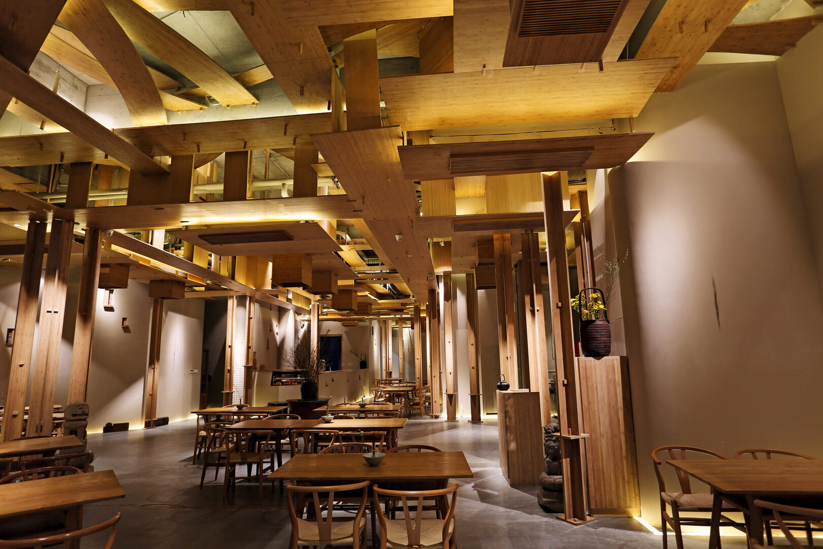 The architectural design of this restaurant is inspired by traditional house building techniques in rural China. Wood as the main construction material has been used for centuries in traditional Chinese architecture. The individual ceiling beams form a frame held together only by mortise and tenon joints, another characteristic feature of traditional Chinese housebuilding techniques. The ceiling construction intentionally remained uncovered, so that visitors are able to see and marvel at the impressive carpentry work.