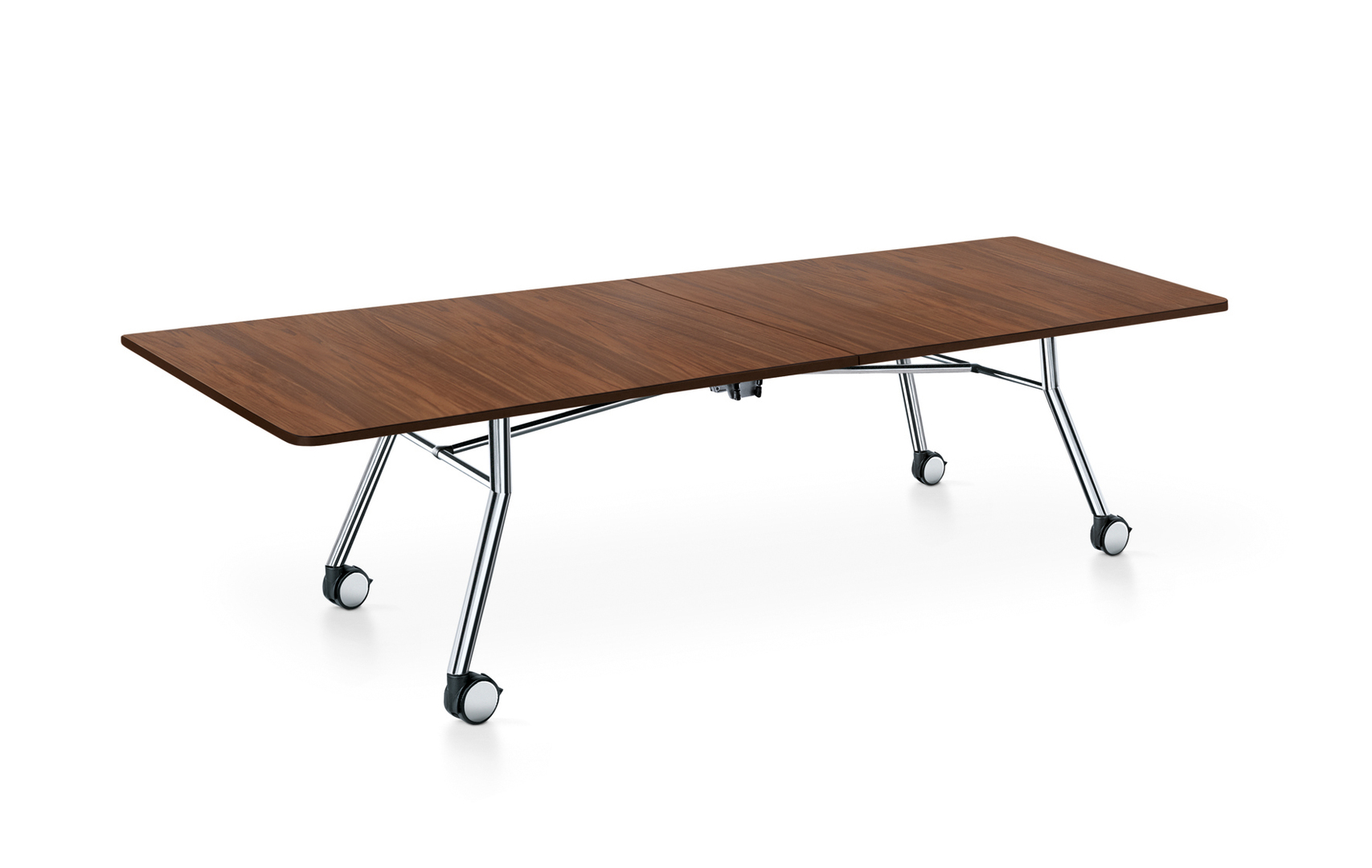 The design of this folding table focuses on the folding mechanism, which guarantees high safety and user-friendliness thanks to its innovative kinematics.
