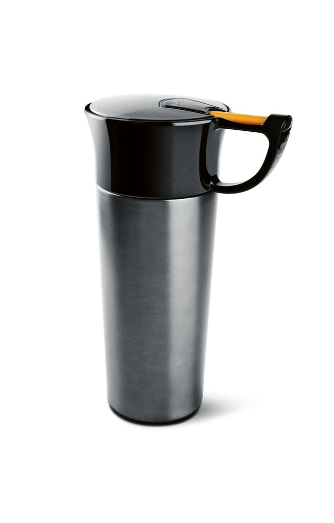 Max is an insulated stainless steel cup which maintains the beverage temperature for approximately two hours. The lid can easily be opened and closed using a specially developed mechanism: an iron spring, wrapped in soft rubber, connects the lid and handle. The spring, marked with a striking colour, responds to a light touch and causes the lid to spring open at a wide angle. The insulated cup is also equipped with an integrated tea strainer.