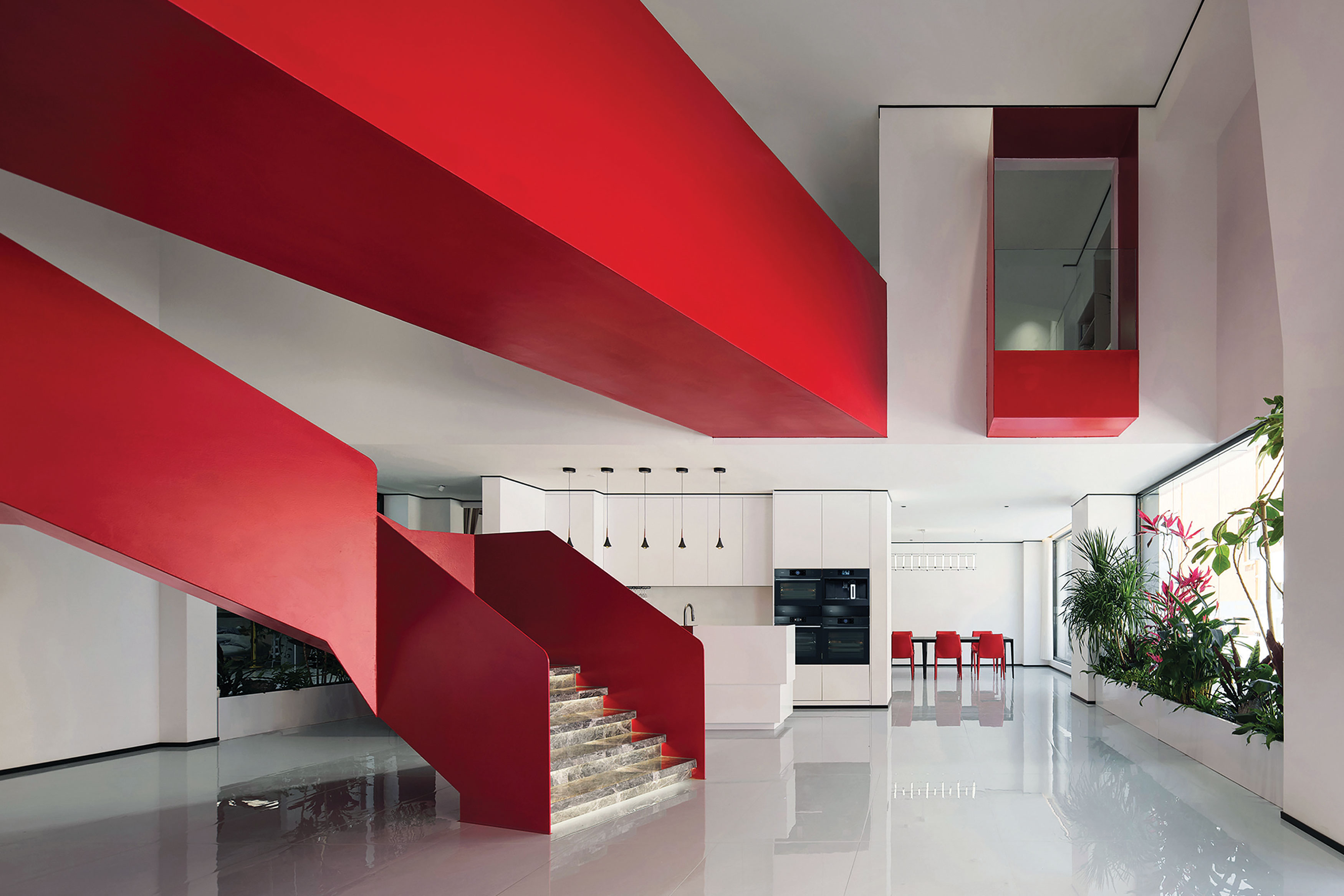 MDEE embraces a deconstructivist style that enhances air circulation and comfort while creating a dynamic, culturally rich space. Featuring red-and-white tones, flowing staircases, and a red sky bridge inspired by Chinese aesthetics, the design balances visual impact and elegance. Natural lighting, ventilation, and eco-friendly materials support sustainability, energy efficiency, and safety — a commitment to green architecture and human–nature harmony.