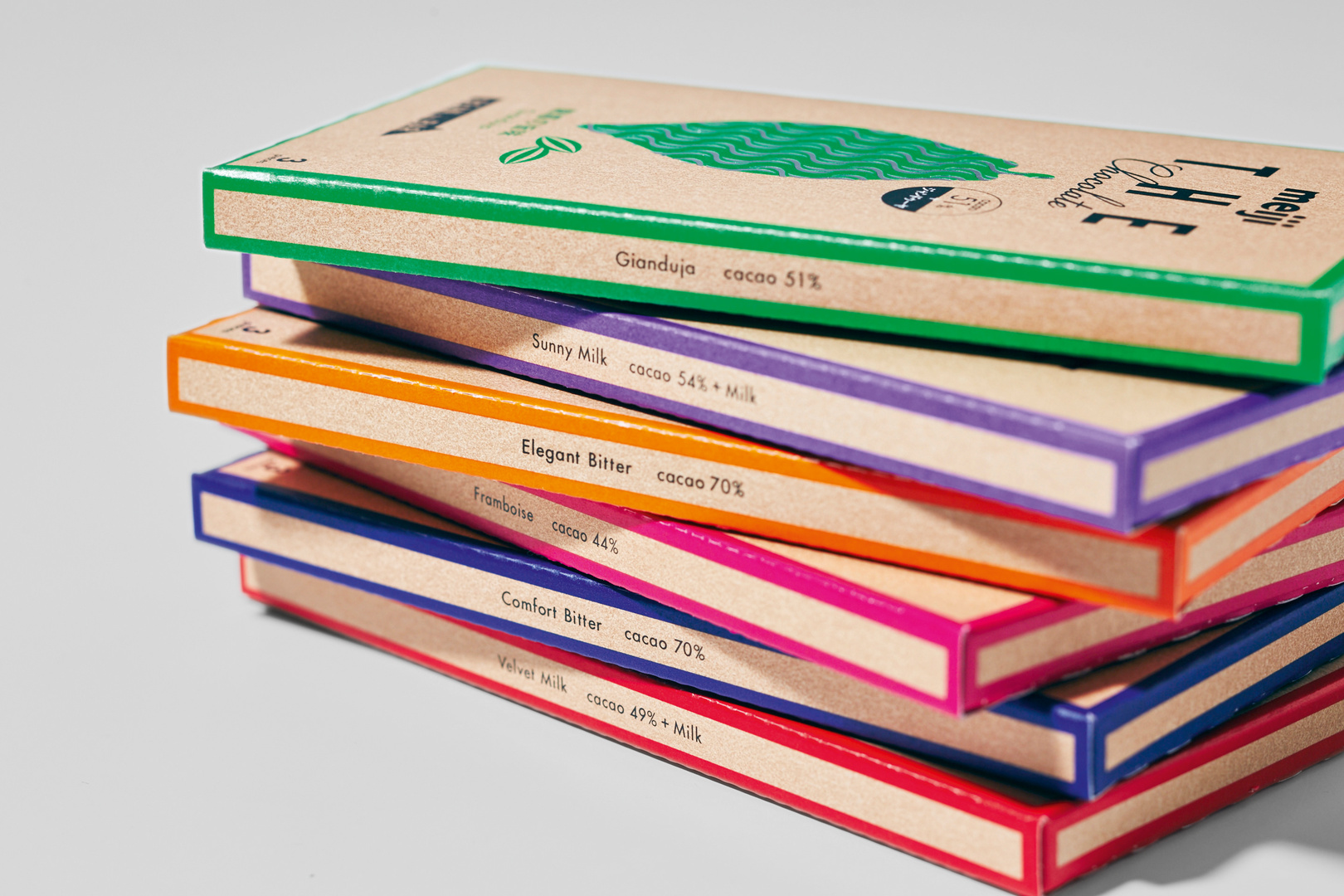 This product uses a simple packaging design that features the logo, illustrations of cacao and a kraft paper texture. The foil stamps and colours vary according to the cacao flavour. By displaying the variety of designs side by side, the boxes look like a book series. The layout was chosen to evoke a page from a cacao reference book. The key visuals on the front are abstract patterns to reflect the individual characteristics of the bean used. While the outside of the package remains simple in order to convey the message clearly, the inside is lined with the full pattern to evoke a sense of excitement and expectation upon opening.