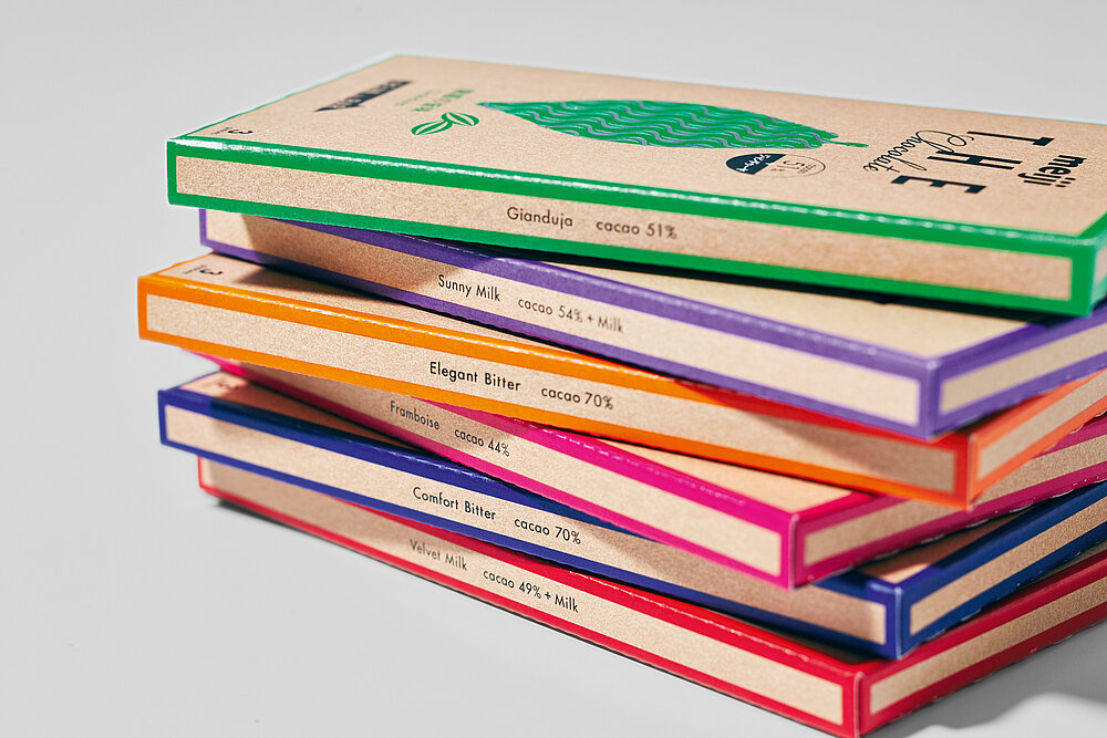 This product uses a simple packaging design that features the logo, illustrations of cacao and a kraft paper texture. The foil stamps and colours vary according to the cacao flavour. By displaying the variety of designs side by side, the boxes look like a book series. The layout was chosen to evoke a page from a cacao reference book. The key visuals on the front are abstract patterns to reflect the individual characteristics of the bean used. While the outside of the package remains simple in order to convey the message clearly, the inside is lined with the full pattern to evoke a sense of excitement and expectation upon opening.