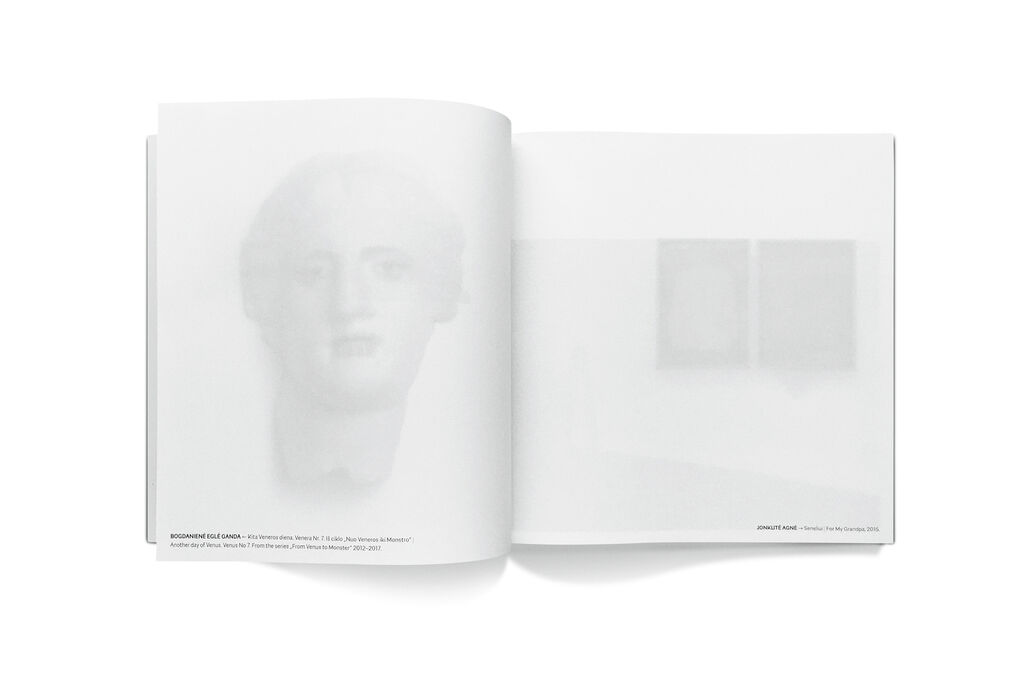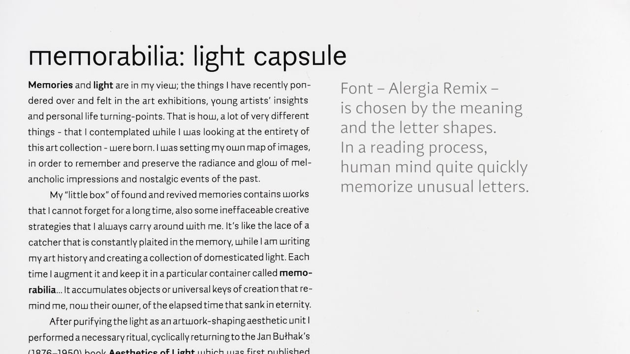 The book “memorabilia” aims at attracting reader attention to the topic of memory and the processes of remembering by unusually presenting works of Lithuanian artists. It is like a play with the human mind. At first, only the texts can be fully seen and read, while the works of art featuring on the other side of the pages remain hardly perceptible as they are only hints. This effect of transparency has been created by using reverse printing in a low percentage of black on the hidden inner pages. However, these double pages can be “unlocked” by cutting them. Thus, readers are invited to figuratively put an effort into remembering and perceiving the known Lithuanian artworks in all their colours. The “Alergia Remix” font was chosen for the meaning of the name (“alergia” means allergy in translation) and its uncommon letter shapes. Featuring a scratch layer, the cover of the book also aims at piquing curiosity. What lies hidden behind the grey cover layer is left for readers to experience by themselves and thus create a memory for the future.