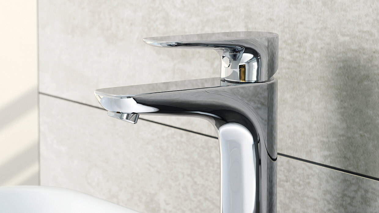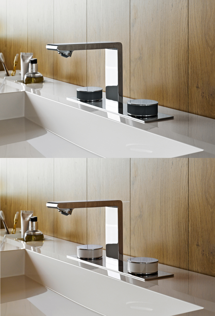 The graceful rectilinear mixers of the Memoria range enhance the contemporary aesthetics of bathrooms with their perfect minimalist shape. This collection of stylish bath and washbasin mixers extends over the entire bathroom space. The washbasin and shower mixers are available with white and matt black metal rings. Easily operated thanks to their palm-touch handles, the environmentally friendly mixers feature a water-saving aerator.