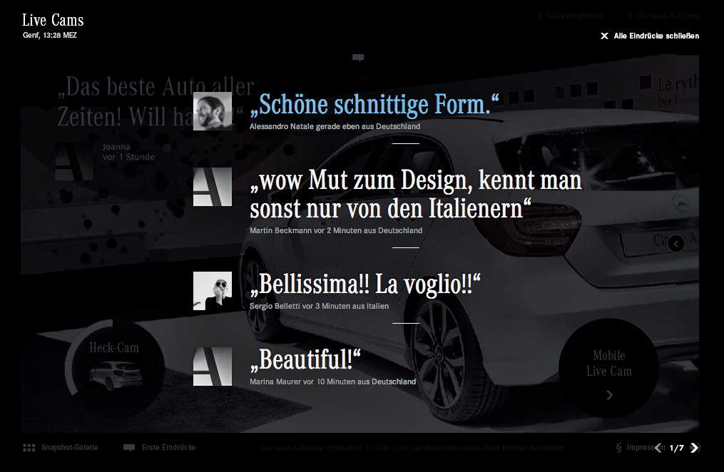 The world premiere of the new A-Class was presented via a web special live from the Geneva Motor Show. Since no company product details of the new A-Class were to be disclosed, the idea was to inform the target group via trade visitors and online users talking about their first impressions. With a mobile camera team and hosts at the booth, the online users could ask about vehicle details and the visitors at the trade fair responded by describing their live impressions. Fixed cameras, showing the A-Class from different angles, rounded off the overall impression of the vehicle.