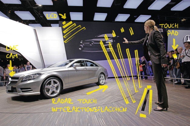 Via an interactive presentation tool, the visitor was able to experience the technology of the new Mercedes-Benz CLS in a virtual way. In real time, the presenters interacted with the vehicle, the LED panels behind it, and the audience. Via hand movements in sensitive fields, the presenters could create, move and enlarge terms, graphics and image windows. Visitors could create pro-grammes themselves by using touchpads which could be operated intuitively.