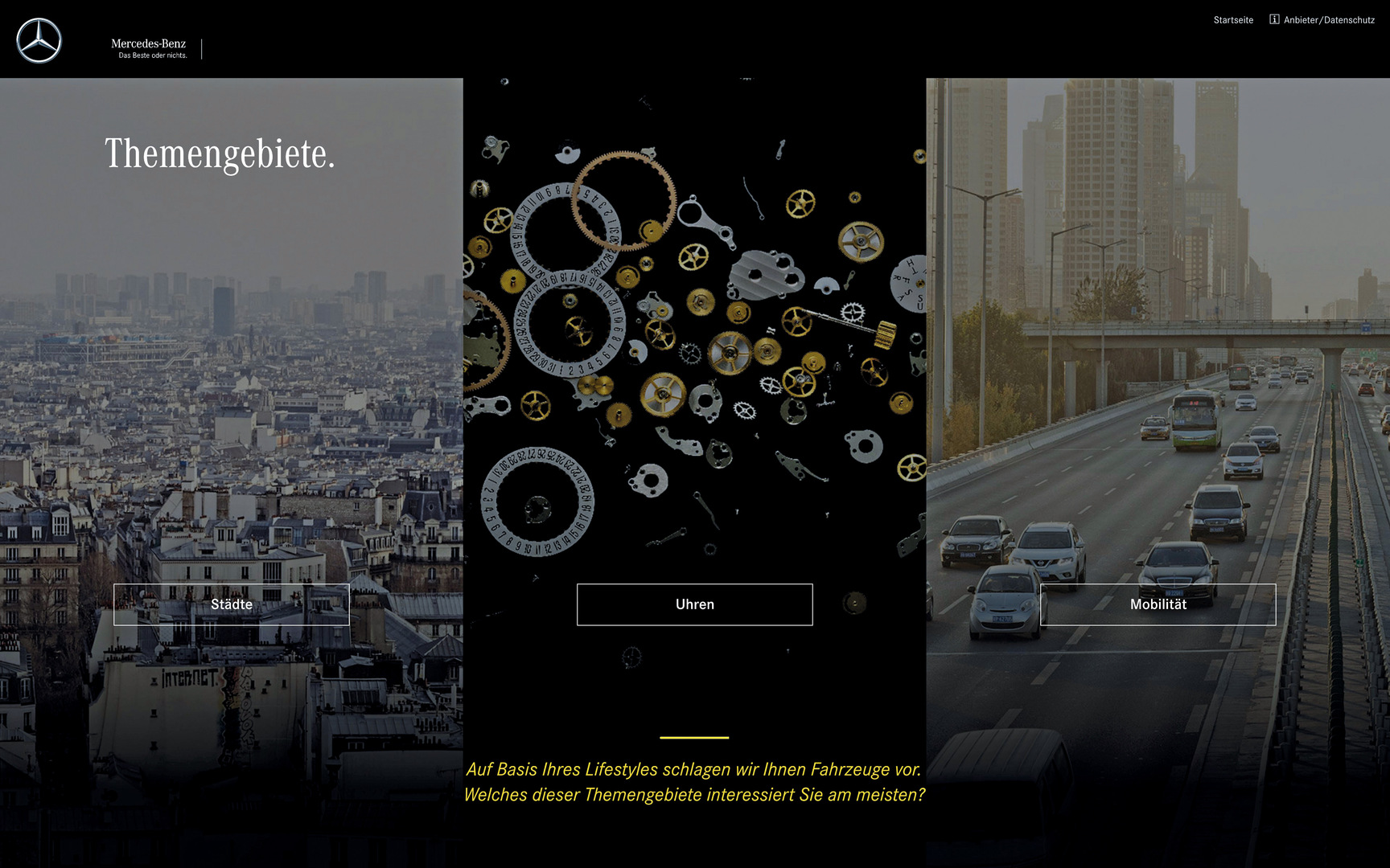 The Mercedes-Benz Lifestyle Configurator convinces by taking away customer fear of contact in planning the next vehicle purchase. It makes users feel they are an active part of the planning process by collecting and analysing soft factors that are more familiar to users than purely technical aspects of vehicles. The configurator thus leads customers through the decision process in a playful manner.