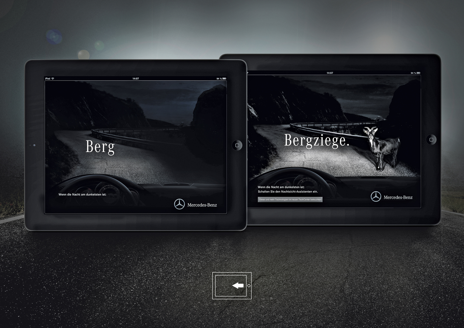 The aim in designing the Mercedes-Benz iPad advertisement for Night View Assist was to bridge the gap between the typical flow of reading digital content and the effectiveness of advertisements. It was conceived as a double-layer version, which relies on the iPad’s normal swiping action to open as the user turns the page. The advertisement thus communicates the function of Night View Assist in a simple manner, demonstrating that it is possible to detect dangers early on when driving through a seemingly harmless night landscape.