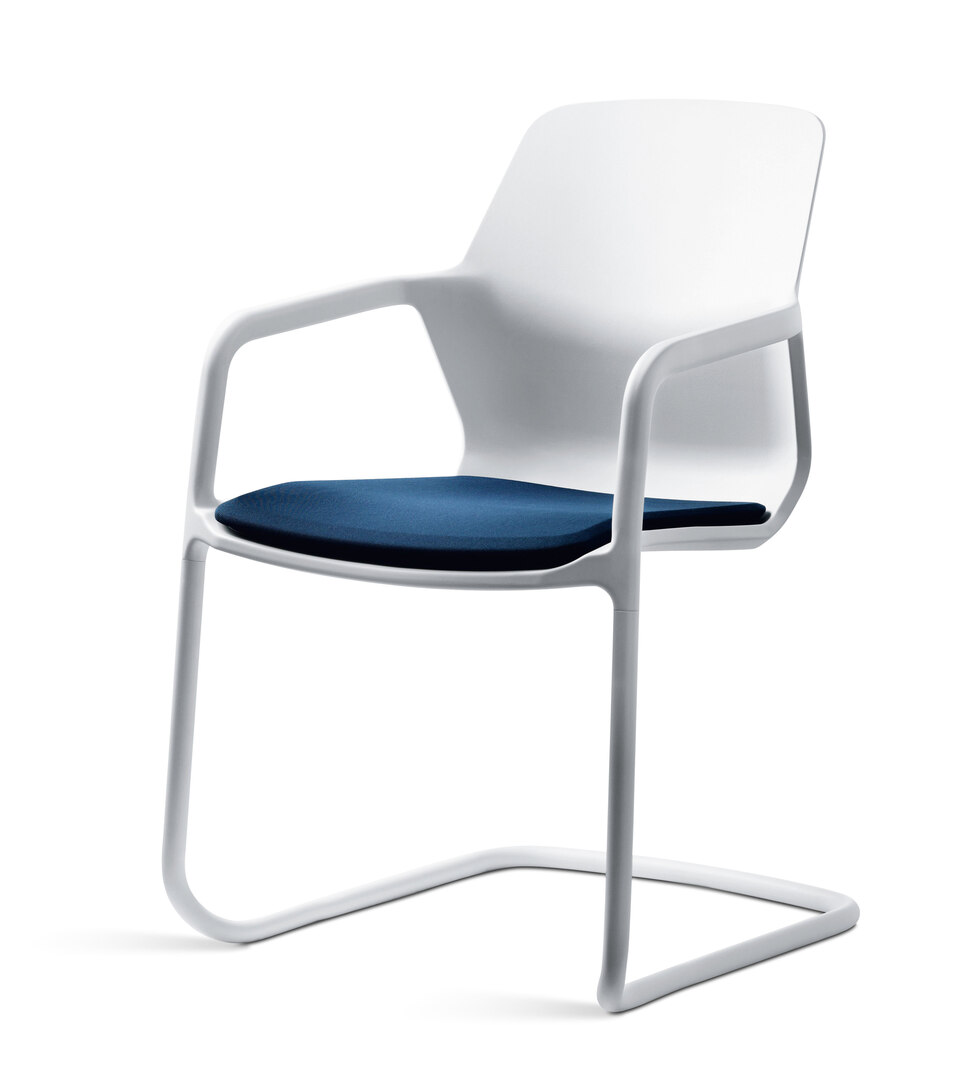 Metrik is a chair that appears to be cast in one piece. Backrest, seat and armrests of the cantilever chair create a monolithic body whose form-fit connection with the tubular steel frame is only revealed by a narrow gap. The anatomically designed cushioning of the backrest and seat provides highly comfortable seating. Six colours for body and frame as well as a wide variety of cover options allow versatile combinations with different desk concepts and office chairs. In this way, Metrik blends into the overall design concept in accordance with user preference.