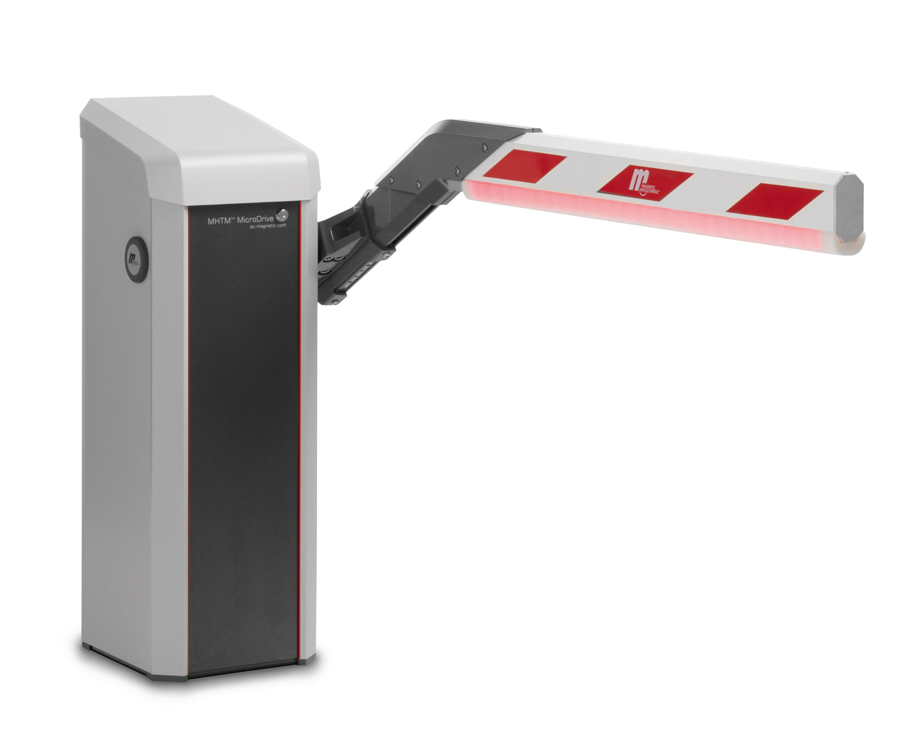 The MicroDrive barrier features a self-contained, compact design. The angular connection of the boom, measuring up to 6 meters in length, allows for a lower construction of the housing. Moreover, it enables the control unit, which is accessible from all sides, to be built at an ideal working height for service technicians. Modules like the dual arm, the display area and the underride guard have been consistently integrated into the design. The foam-covered light bar also acts as impact protection: boom movement is immediately stopped when objects are encountered.