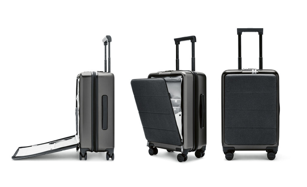 At the airport, travellers regularly have to present items from their hand luggage, such as a laptop, travel documents or an umbrella. In this metallic shimmering case made of sturdy polycarbonate, personal belongings can be stowed in the upholstered front compartment and quickly be taken out when required, while the main compartment remains closed. TSA locks secure the valuables inside the luggage. A brake lever for the 360-degree rotating wheels ensures that the case does not roll away unintentionally – a practical function when travelling on public transport.