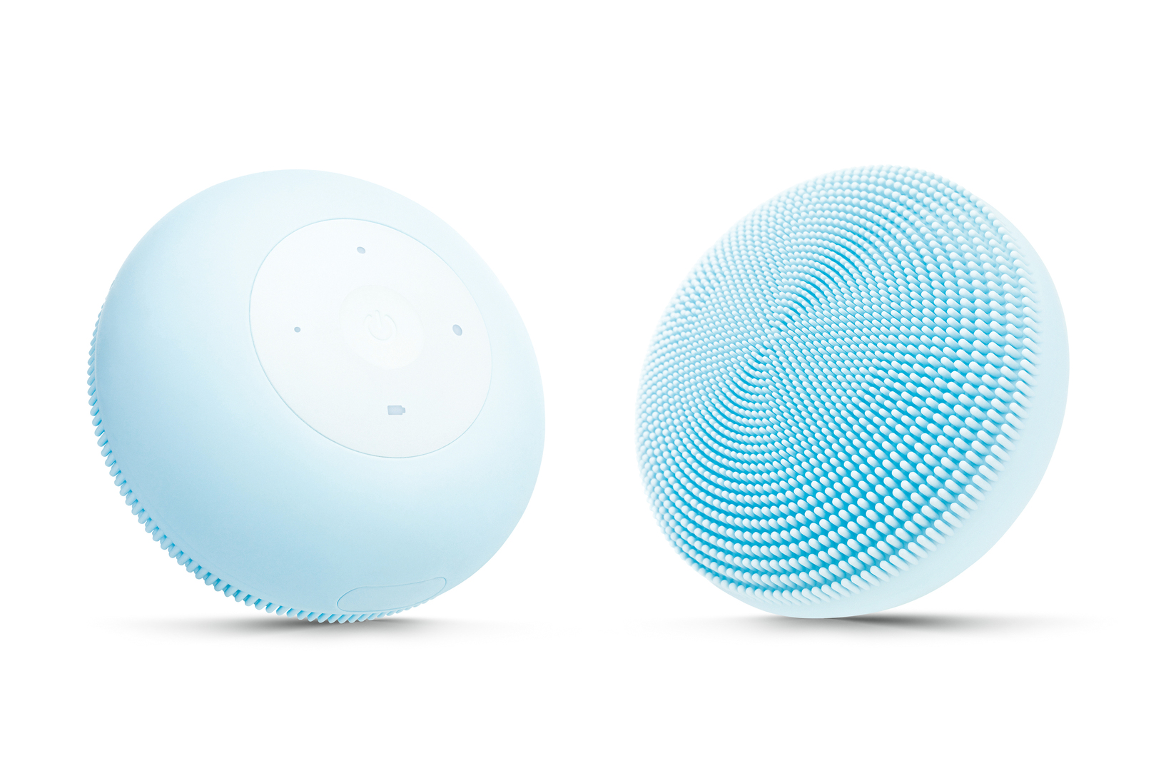 This ultrasonic cleansing brush features a silicone outer layer with antibacterial silver ions and an inner layer made of SEBS rubber. The motor is suspended on the inner layer and works with even vibration, which enables efficient cleansing while protecting sensitive skin. As the diameter of the bristle tips on the curved surface gradually changes from 0.6 mm to 1.2 mm, different areas of the face can be treated properly with the device.
