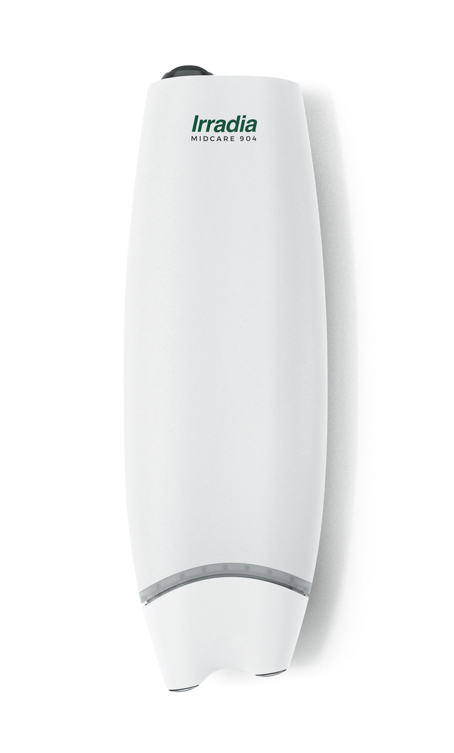 MidCare is a handheld medical laser designed for domestic treatment of inflammations. The concave surface provides an ergonomic grip, and the angled front of the device ensures optimal skin contact and also good reach when treating various points on the body. For ease of use and safety, the laser is activated by pressing the front of the device against the skin, whereupon a ring around the front lights up, indicating that the laser is active.