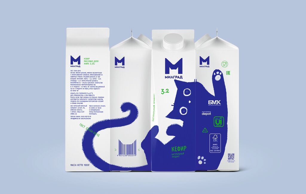 Competition among dairy products in Russia is fierce. That is why a blue cat was developed for the Milgrad brand of the Bryansk dairy to highlight the products on the shelf with something really new and cute to win the hearts of consumers. The cat roams over the packaging of the various dairy products, peering expectantly from around the corner, toying with a string or simply staring curiously at the consumer. The illustration starts on one side of the packaging and continues on the next side so that the viewer can interact with it directly on the supermarket shelf. At the same time, several packs can be joined together to show the complete cat gliding across the packaging. In this redesign, the familiar and frequently used colour coding was retained: white for milk, green for kefir and light brown for buttermilk. The background is kept in minimalist white, while a different font colour sets the foodstuffs apart. The furry ambassador appears on every product and has managed to win the hearts of people and media channels far beyond the country’s borders in a very short time.Statement by the juryThe packaging design for Milgrad is absolutely outstanding and exceptional. The concept of showing a kitten in different poses and having it run around all sides of the packaging is clever and very well executed. The simple yet eye-catching design immediately fascinates the consumer, inviting them to look at the entire packaging from all sides. The possibility to play with this design on the shelf and thus build up different scenarios is equally ingenious.