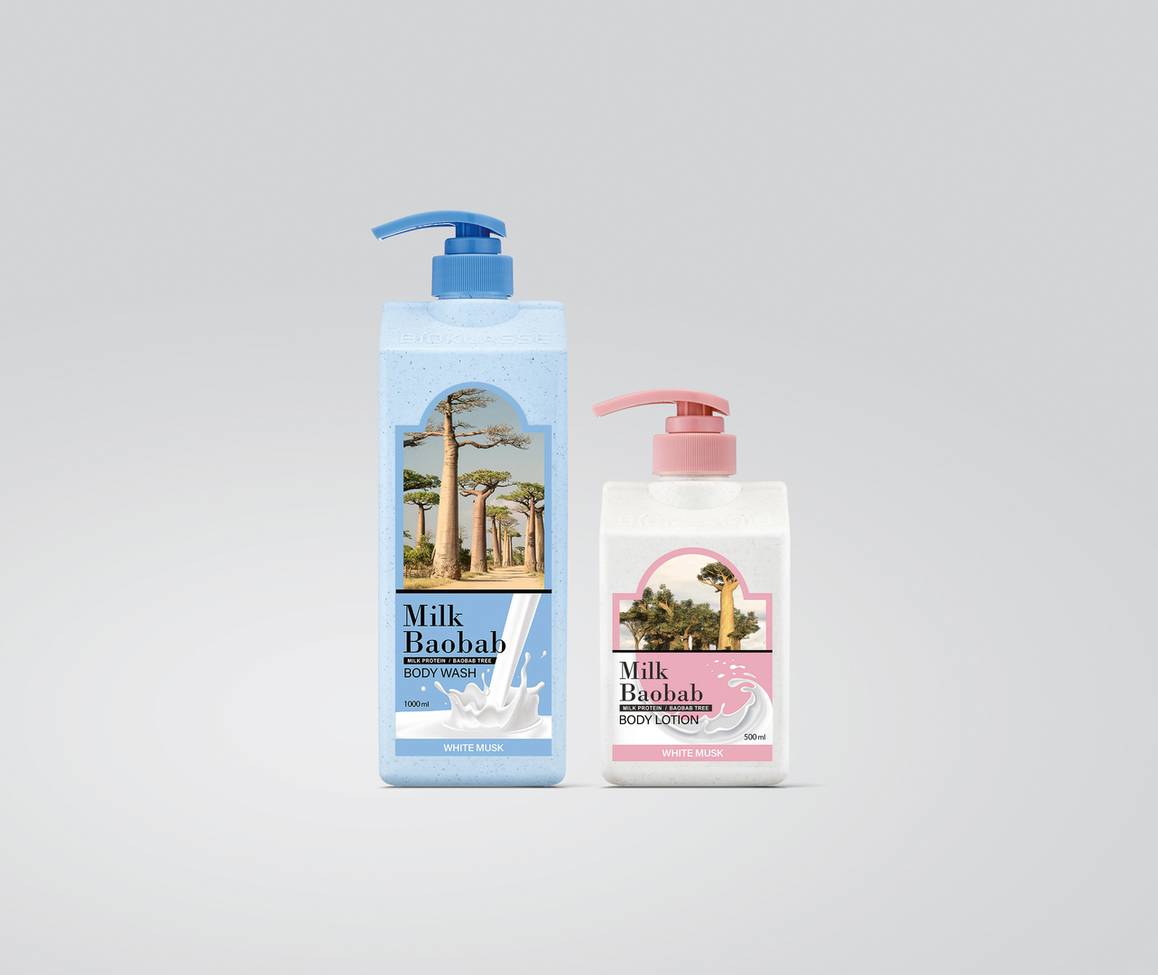 The packaging design of these hair and body care products is, on the one hand, inspired by milk and, on the other, by the baobab tree, thus hinting at two characteristic ingredients used in all of the products. The containers are in the shape of milk cartons, with gently rounded edges to prevent injury and with subtle dots of carbon in the printing. The labels feature powerful imagery, allowing the ingredients to be intuitively recognised. In order to make sure the different products can also be distinguished easily, the containers are of different colours.