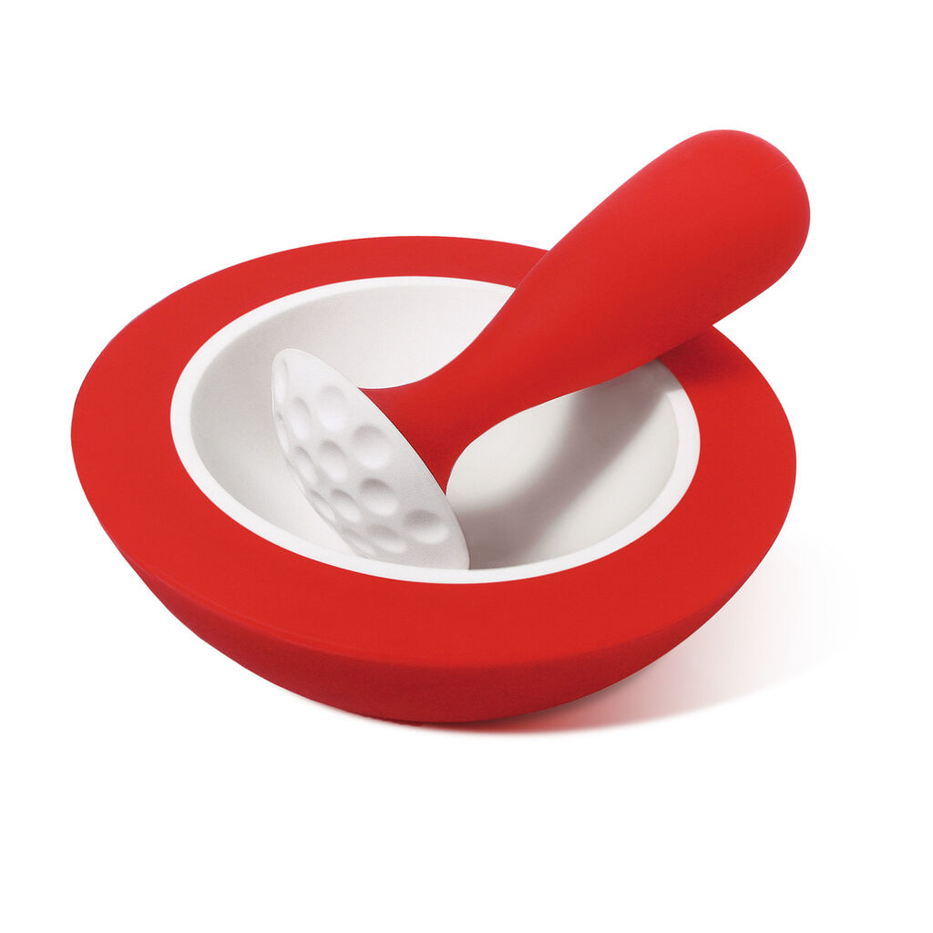 For this mortar the ceramic pestle head is so designed that roughness, which provides the necessary friction, consists of concave indents. The edges of the extensive indents are ground sharp. This particular form facilitates the grinding process and ensures that nothing remains sticking to it. The sensitive ceramic is only used for the pestle head and the interior of the mortar; the rest is made of silicone.