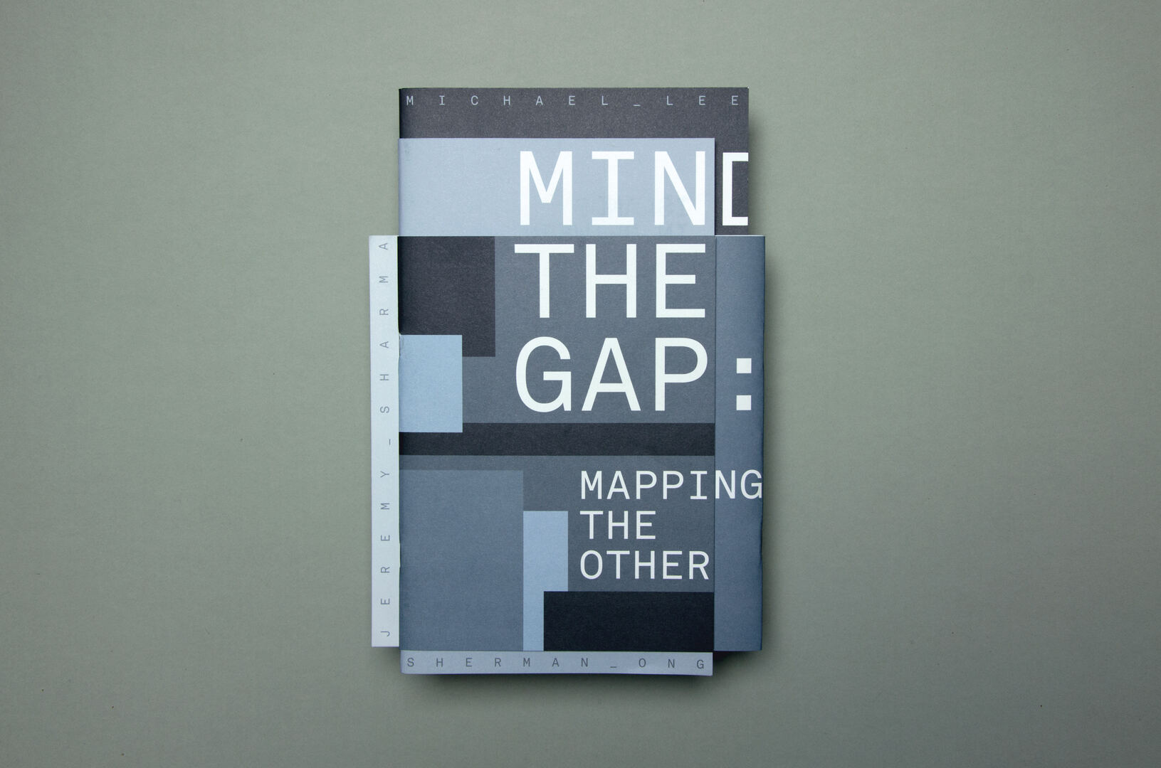 “Mind The Gap” is an exhibition focused on mapping, featuring three artists commissioned to create artworks based on the data of their chosen findings and research. The catalogue documenting the exhibition is segmented into three irregular, individual sections for each artist. The design plays with space as a visual pun to reflect the title carefully coming together to form the cover. Bars and monospaced fonts evoke the sensation of cold hard data.