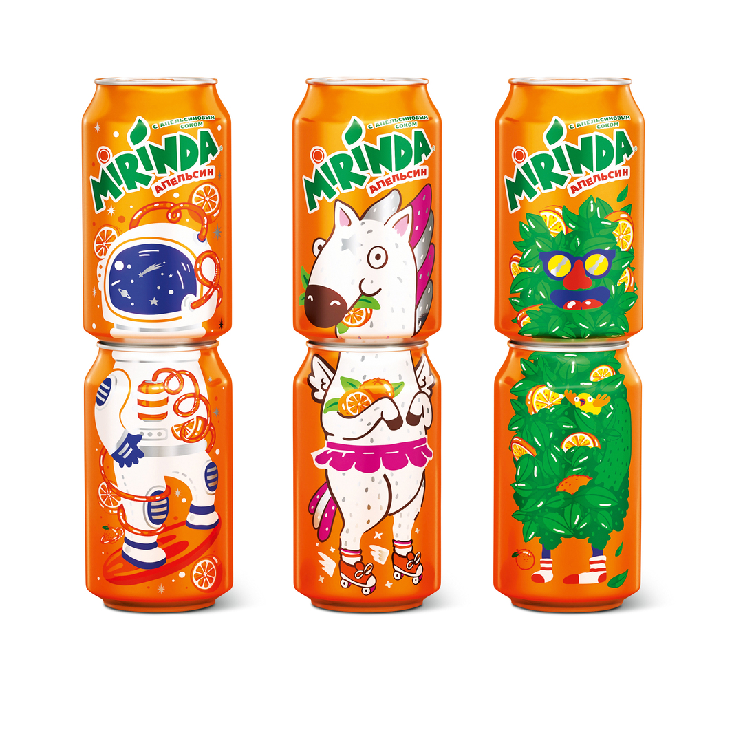The design of the Mirinda Unexpected Combo limited edition evokes a playful, vibrant and spontaneous mood. Six unique characters, whose upper or lower body are portrayed on different cans, invite consumers to create their own unexpected combinations. The edition encourages to collect the cans, rotate them, stack them up or play with them in many different ways. The cheerful, hashtag-worthy design reflects the character of the brand and makes sure the cans stand out on supermarket shelves. The concept was used to develop two collections, one for the Russian and one for the Polish market.