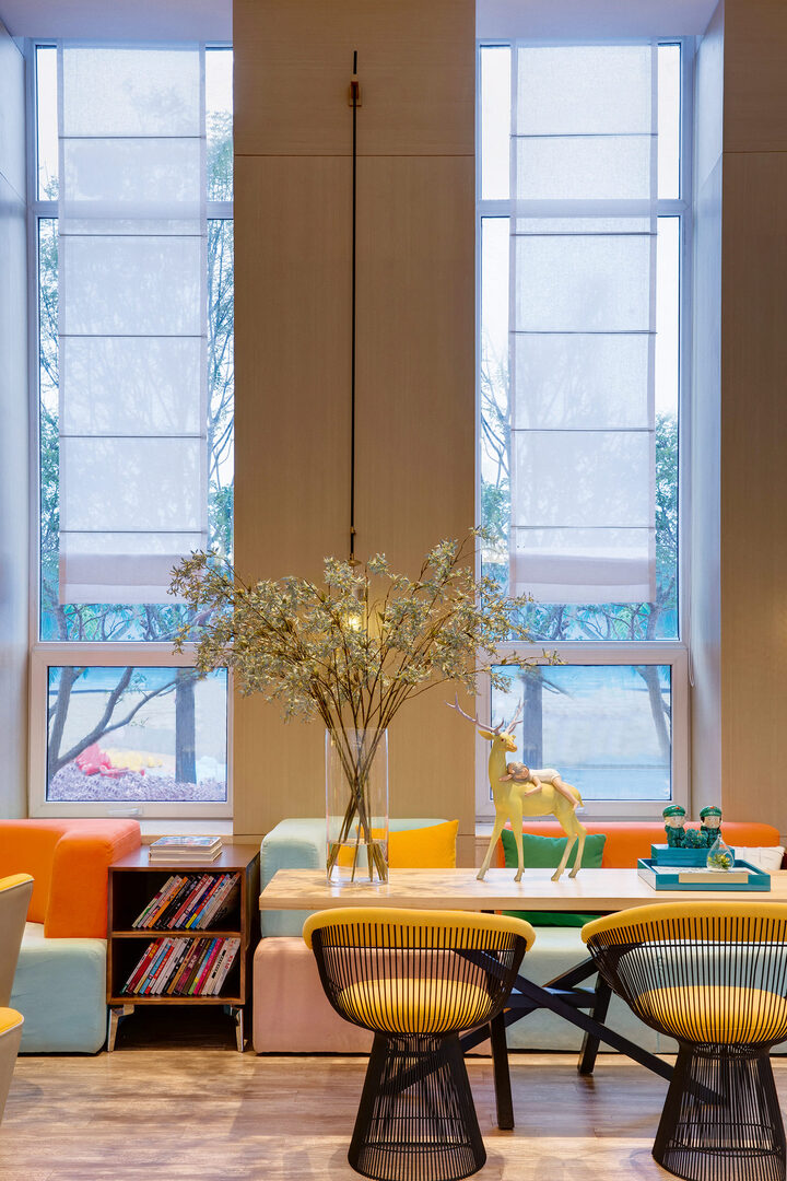 The resemblance of this sales office to a private living room is what makes this interior design so astonishing. It creates an unusually intimate atmosphere for a business environment.