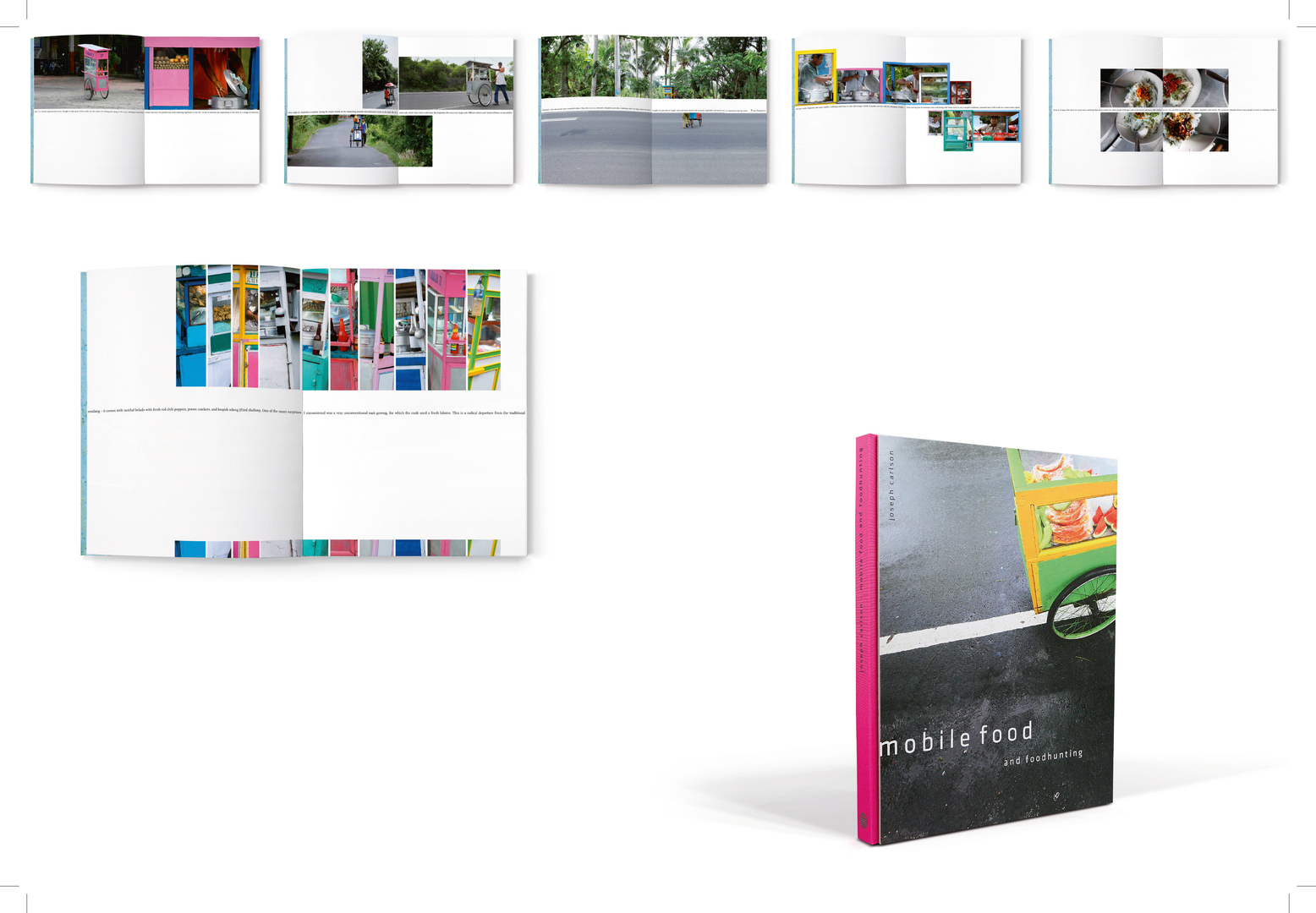 The book “mobile food and foodhunting” expressively brings its content to life. The main theme of the book is not the cookshops of Bali, but rather the direct, visceral experience of this time-honoured culture. More than just documenting the subject matter it investigates, it conjures up the power of first-hand experience. The reader accompanies Joseph Carlson on a photographic journey that is capable of transcending the limitations of the camera. As such, the audience has first-hand access to what Carlson perceived while walking along the island’s streets. The text of the book – the personal accounts of foodhunter Mark Brownstein – forms a single line that extends from the first page to the very last. This gives the book both a sense of direction and a set route to follow. The journey is a process of experience and cognition, travelling a path of ever-original images.