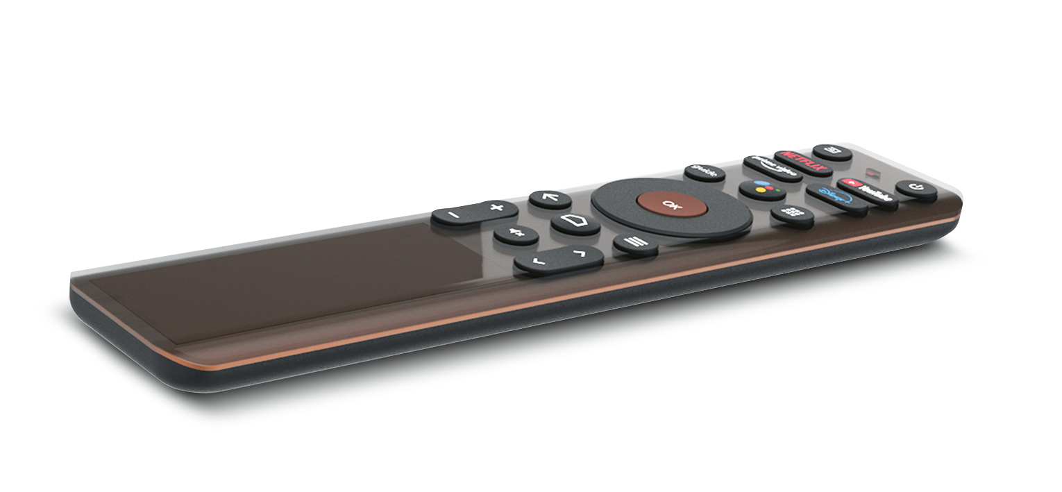 The Model P remote control is solar powered. Thanks to innovative solar technology, eight hours of regular indoor lighting per day are enough to keep it permanently in operation. Even in complete darkness, the built-in power reserves can sustain four months of regular use. The device supports voice commands and allows Bluetooth and infrared control. The solar panel is carefully integrated into the 10 mm thick housing.