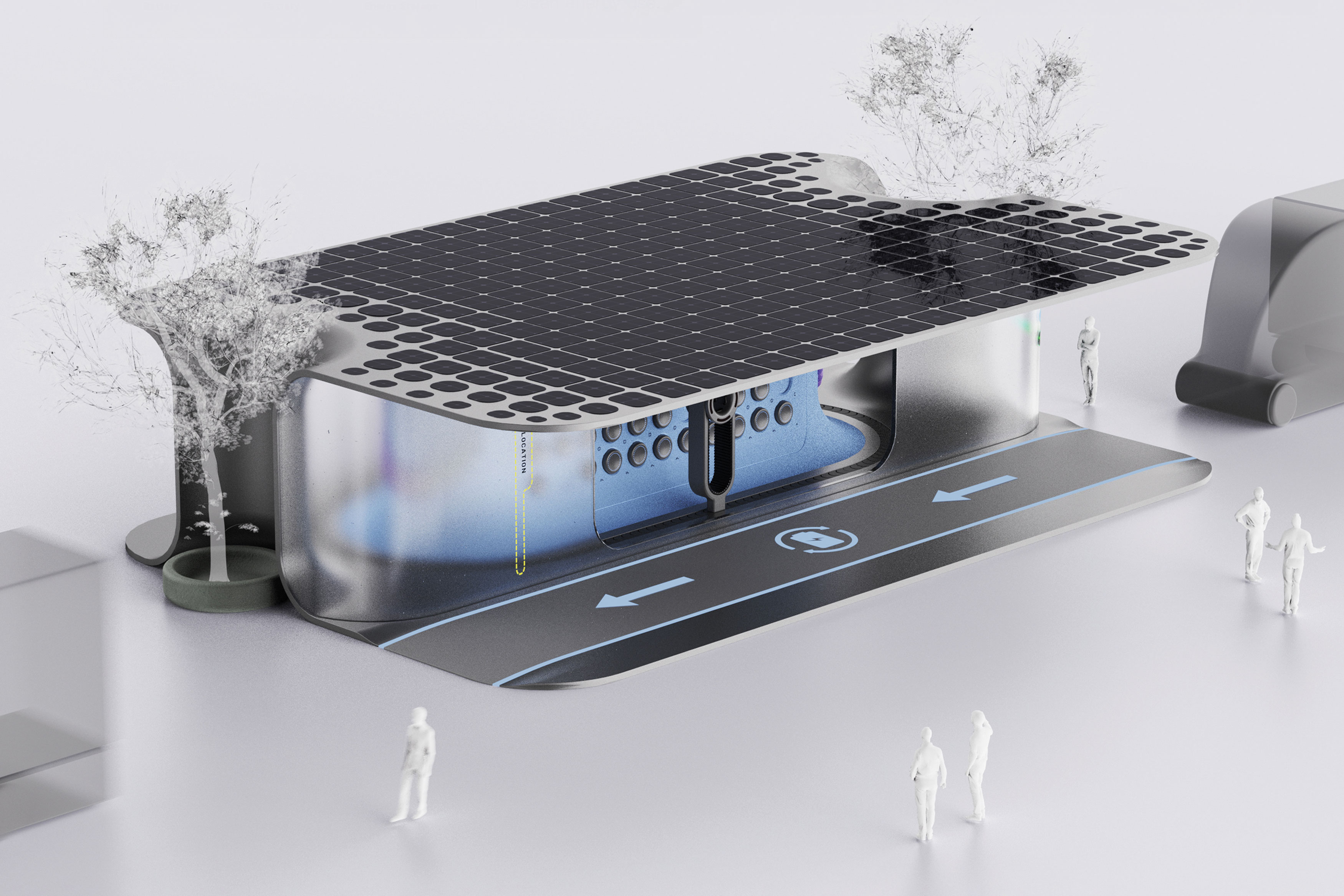 This modular battery swap station matches battery supply to mileage needs, reducing vehicle weight and power consumption. With sensors and AI recognition, a guiding system on the glass navigates precisely to the location of battery exchange. A robotic arm handles the swap seamlessly. Solar photovoltaics also enable each station to supply surplus energy to nearby infrastructure, promoting sustainable energy development.