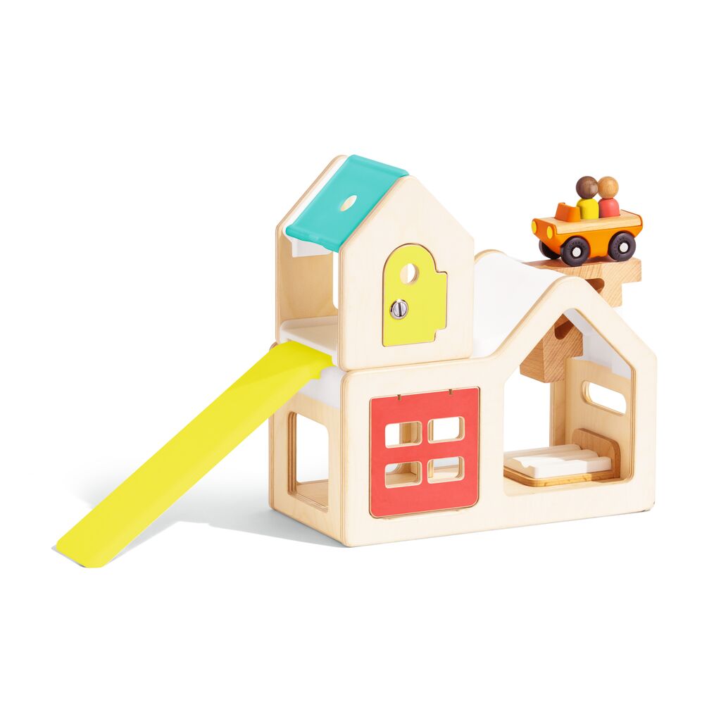 With its simple modular design, this playhouse stimulates the imagination of children every day anew. The natural material, the gently rounded edges and the friendly colours lend it a charming, child-oriented appearance.