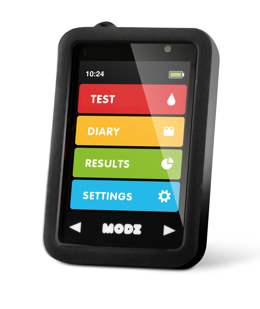 This blood glucose meter with a colour touchscreen has several pedagogical properties. Cartoon characters help one to better understand the meaning of the test results. In the case of good results, the user is awarded points that can be collected to progress to a higher level, like in a game. The meter is covered in silicone, which both protects the meter and makes it feel soft. The LED light at the test strip opening facilitates use even in low-light environments.