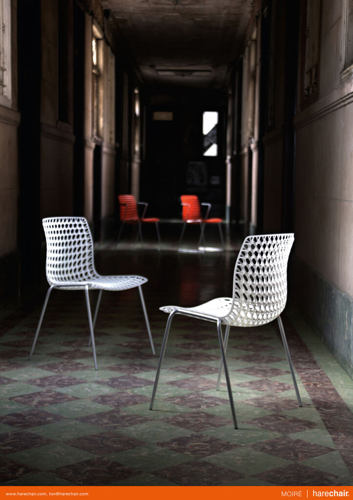 The entirely new functional as well as visual characteristics of the Moiré chair were facilitated through the use of innovative digital technologies. The design studio “Ton Haas industrial design” thus managed to develop a chair that turns a fascinating design idea into a vivid user experience. The layered structures and the resulting moiré effect led to a seating object of outstanding quality.