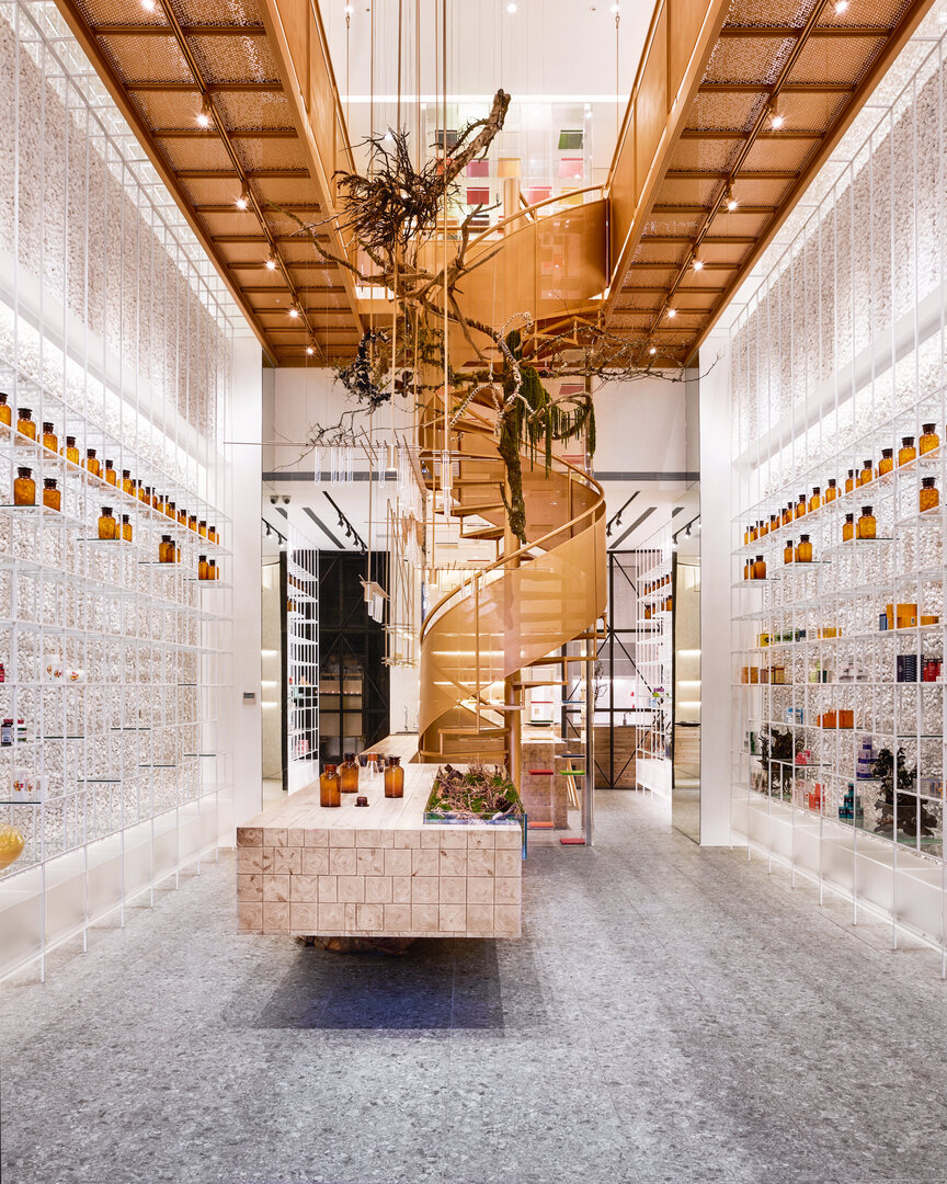 The name Molecure is split and reorganised from the words “molecule” and “cure”. The design approach returns to the original purpose of pharmacy – extracting molecules from nature to synthesise drugs that cure diseases. It centres around the idea of building a space which is named “green in the lab” and combining the seemingly conflicting qualities of primitiveness with technology, just like new compounds formed due to processes at the molecular level. The design reflects the two characteristics of a molecule – connectivity and aggregation.