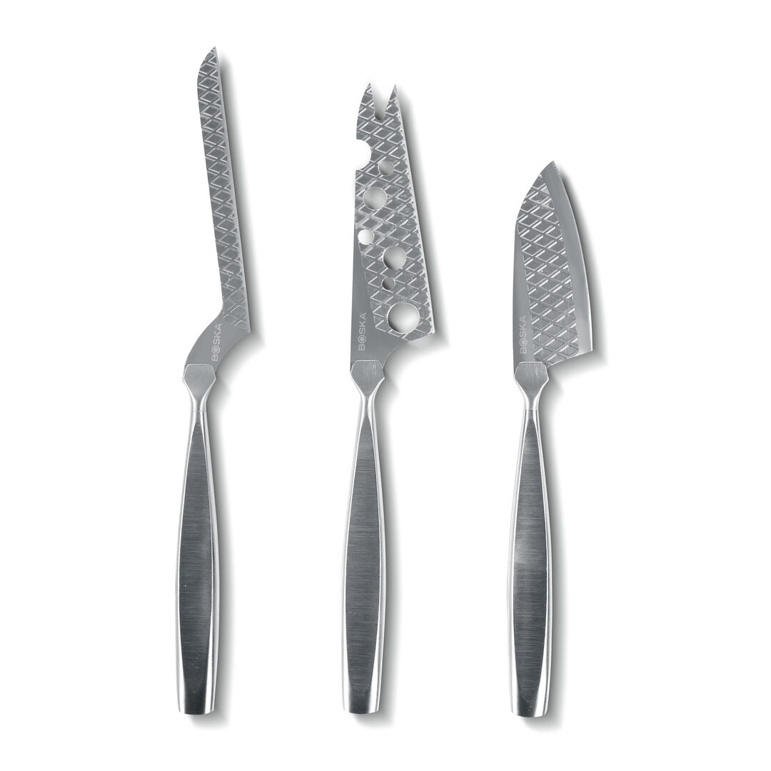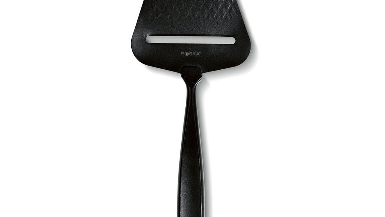 This series of handy cheese knives made of dishwasher-safe stainless steel enables easy cutting of different cheese types. The patented waffle pattern of the blade reduces the contact surface, which preserves the consistency of even soft, sticky cheeses. The long, thin knife is suitable for cutting soft kinds of cheese, while the knife with the holes is suitable for the soft and semi-hard ones. For breaking up very hard cheese types such as Parmesan, the short knife features a sharp tip.