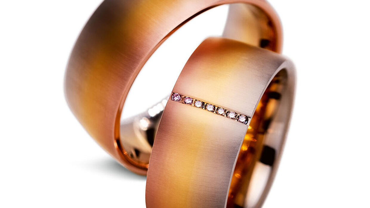 Inspiration for this ring is the rising sun. This daily recurring, natural spectacle is artistically realised in the form of various nuances of 18-carat gold tones, generating a gentle colour gradient. A hundred natural-coloured matching diamonds create a warm glitter. The finely structured surface and the organic design on one side of it emphasise the sensual character of the ring.