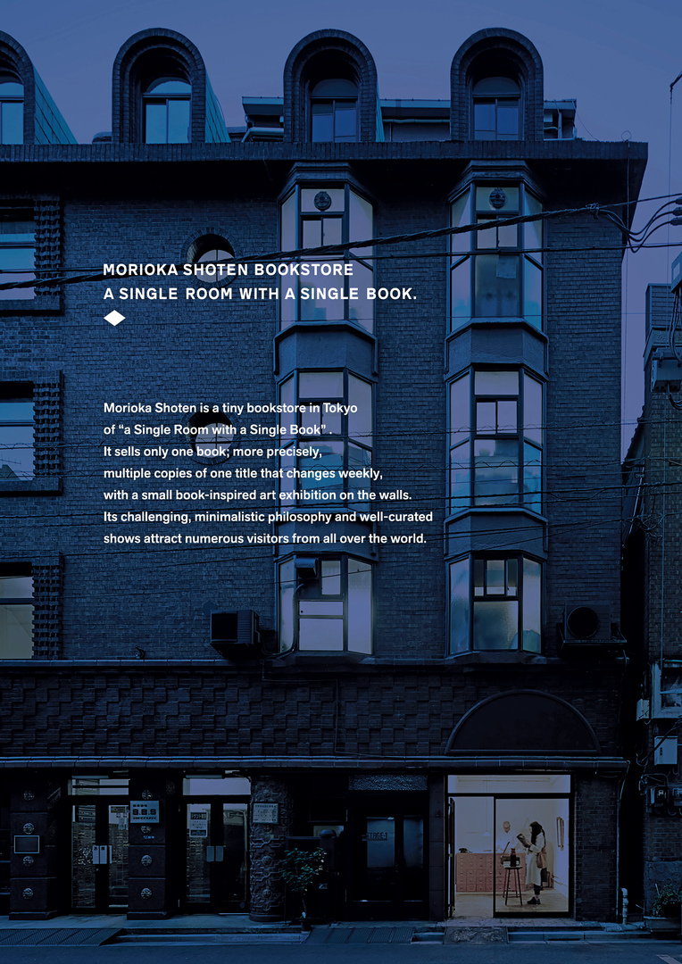 Morioka Shoten is a tiny bookstore in Tokyo. As its slogan “A Single Room with a Single Book” describes, the bookshop sells only one book; more precisely, multiple copies of a single title that changes weekly, with a small, book-inspired art exhibition on the walls. Its minimalist attitude and well-curated shows attract visitors from across the globe. The branding director created a logo stating the address and the slogan to express the importance of a physical venue in the era of digital reading. The brand design is characterised by effective colour contrasts.