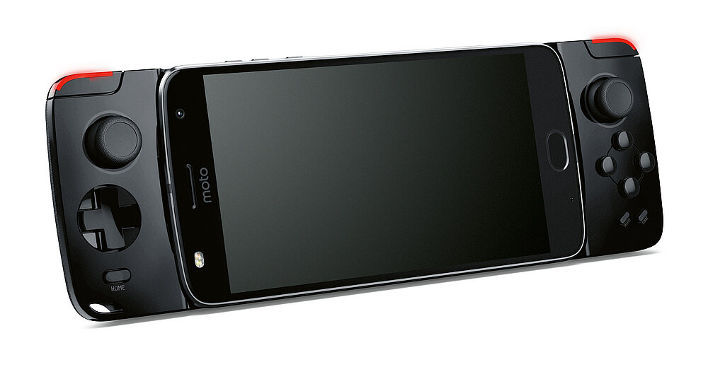 The Moto Gamepad is being attached to a smartphone of the Moto Z series and thus eases control of video gaming. The device includes two joysticks, a directional pad and four mechanical performance keys. Matt surfaces form a strong contrast to the high-gloss activation buttons. Red LED strips on the top side confirm every button press. When being attached, the smartphone snaps securely into the pad.