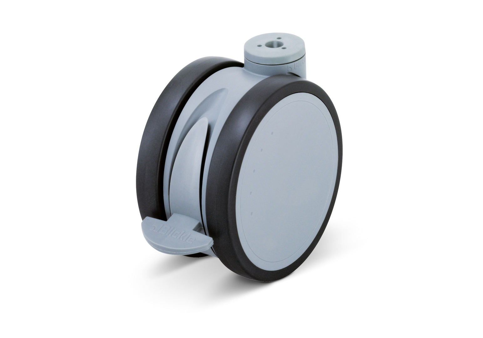 The Move synthetic twin castor features two ball bearings in the swivel head, providing easy manoeuvrability and high operational safety. In addition, the strongly abrasion-resistant tread made of thermoplastic polyurethane lowers noise emissions. The compact housing fashioned from reinforced polyamide in combination with a smooth surface structure meets high safety and hygiene standards. The Blickle Move is also available with a colour-coded locking lever position and in an electrically conductive version.