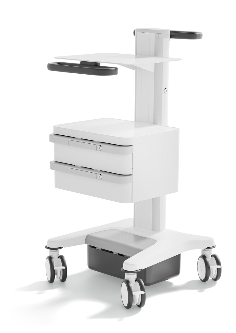 As a mobile equipment cart system, the moveo offers flexible solutions for the challenges of everyday medical routines in hospitals, rehabilitation centres and private practices. With versatile customisation options, the single-column cart system acts as an interface between medical devices and the user. The moveo features a smooth-running drawer system, sturdy aluminium shelves and ergonomic, stylishly designed push handles. The harmonious design of the chassis and intelligent integration of counterweights ensure stability and an elegant aesthetic.