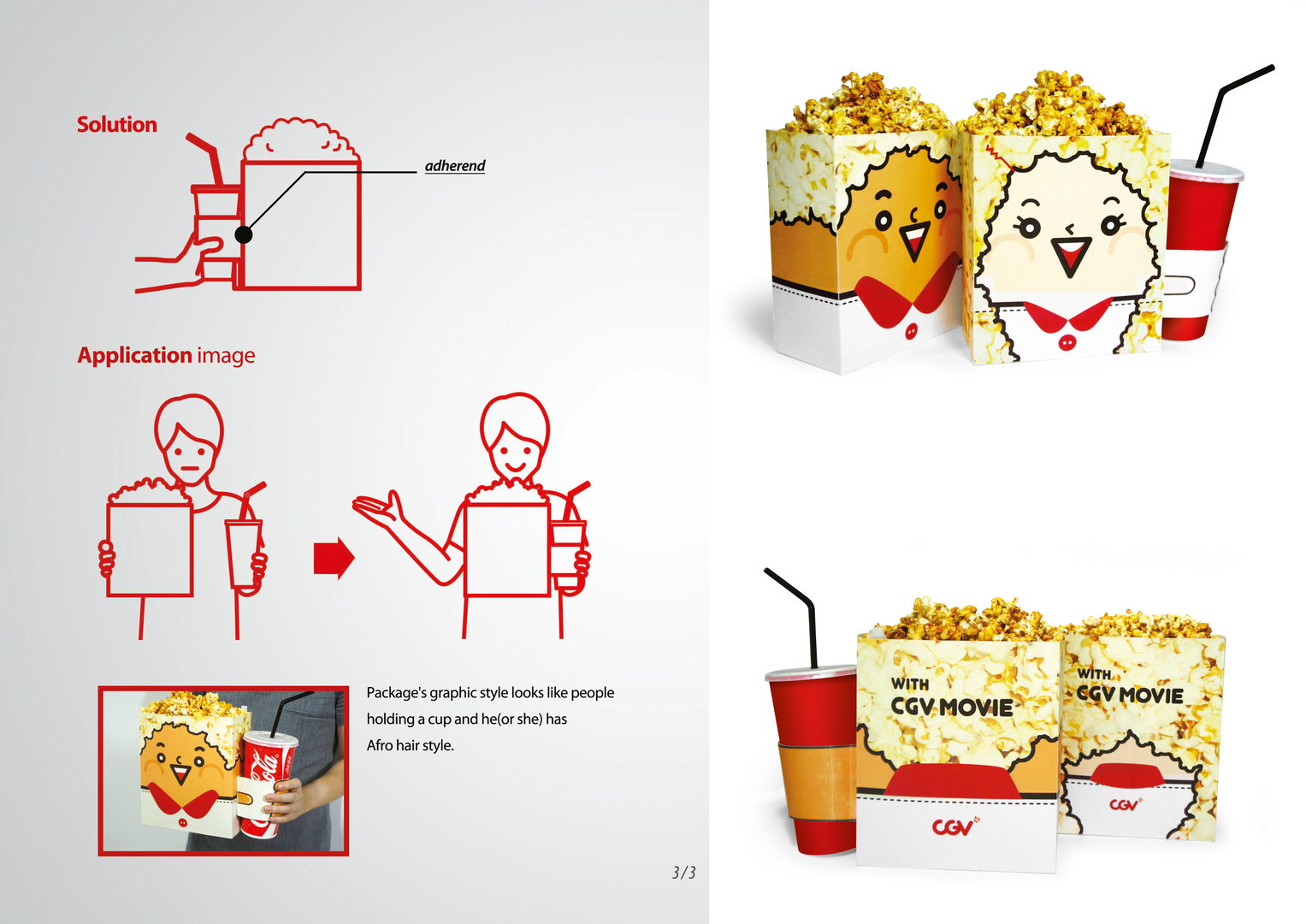 Conceived to make the simultaneous enjoyment of popcorn and a drink at the cinema easier, this packaging solution endeavours to prevent the usual mishaps with sticky foods in the dark. The answer is a design providing popcorn container and cup holder in one, which can be easily held in one hand. The witty graphic design shows a male or female figure “holding” the cup, boasting a blond afro partially consisting of real popcorn.