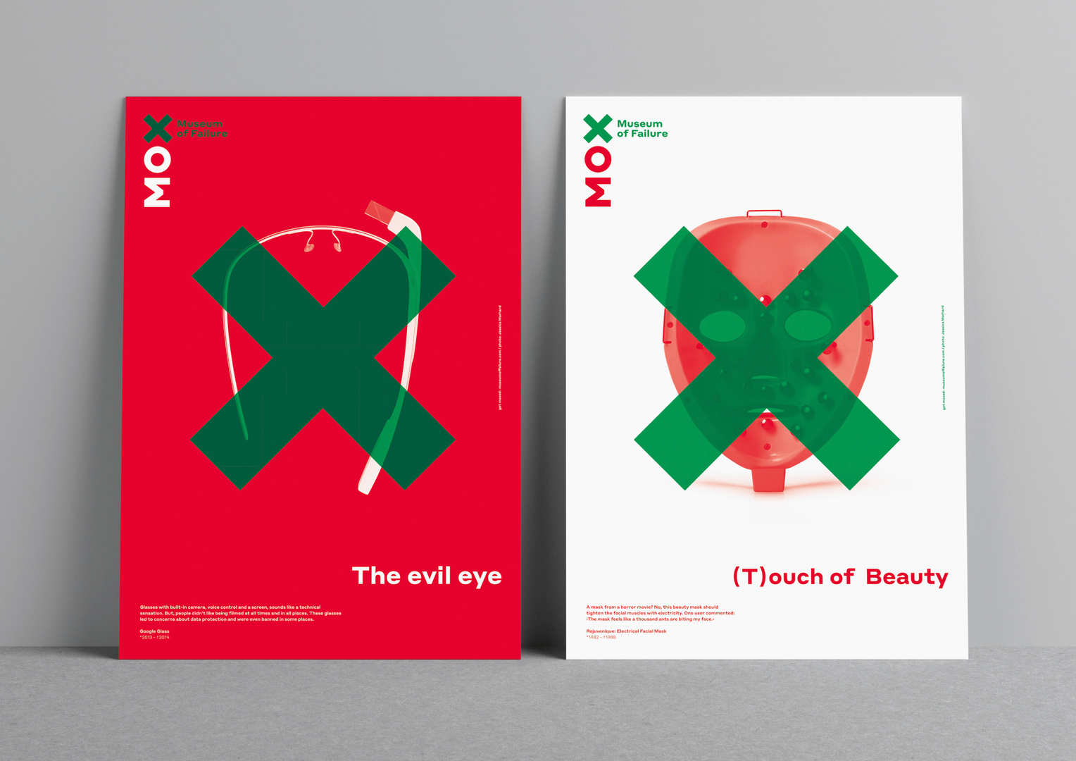 The intense drive for success in our society makes people forget that it is often the mistakes that lead to success in the end. Dedicated to this theme, the Museum of Failure (MOX) presents a collection of more than 100 failed products and services of well-known companies. The new corporate design represents the culture of failure by merging two strong symbols in the logo. The result is a green X as a key symbol for the positive power of failure. For the further implementation of the concept, the green X is used as the key visual, crossing out the red images of the failed products.