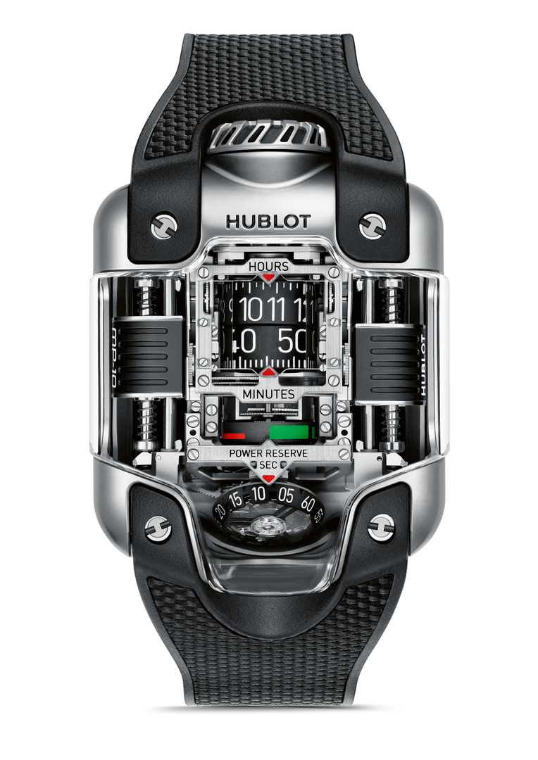The MP-10 Tourbillon Weight Energy System Titanium watch is available in a limited edition of only 50 pieces. It has 592 components and is the result of five years of research and development. Instead of a dial, there are four constantly rotating displays. The hours and minutes are shown in the upper third of the face, the power reserve with a green and a red zone in the middle third, and the seconds directly on the tourbillon cage in the bottom third. A special feature is the tourbillon made from monobloc aluminium, suspended and inclined. The architectural design allows for easy reading from top to bottom.