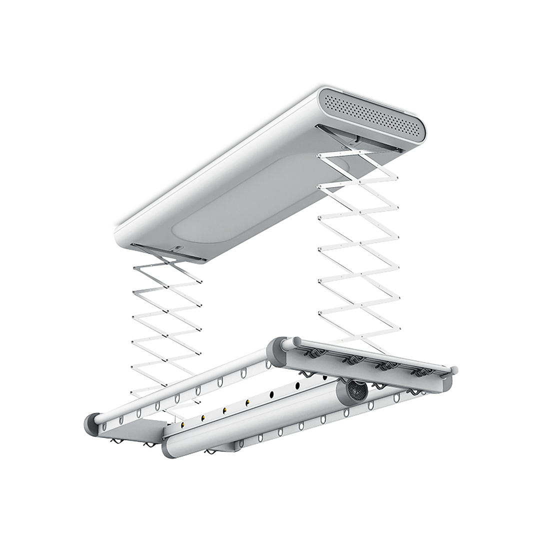 This patented clothes airer is mounted to the ceiling and creates a warm airflow which dries hanging laundry within two hours. Rods and hooks allow the flexible hanging of various textiles. The capacity of the laundry rack, which can carry up to 30 kg, can be increased by additional hooks. The airer can be controlled via an app and is also equipped with light panels which illuminate the area underneath. After use, the rack can be lifted up to the ceiling.